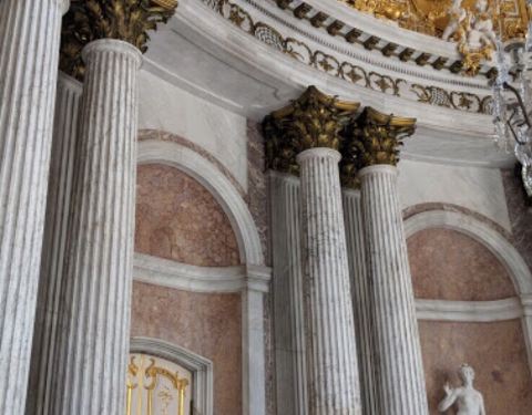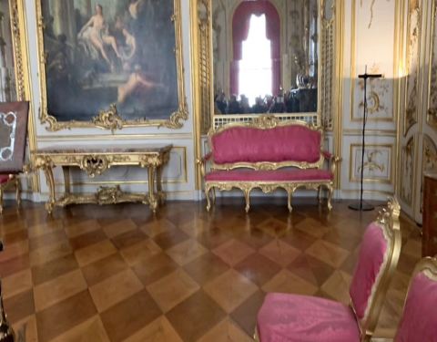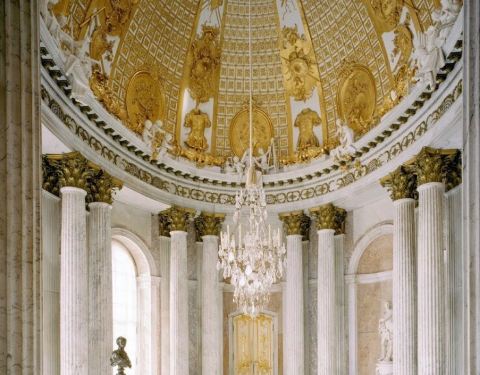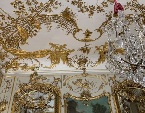 蜿蜒的鎏金枝蔓装饰在天花板上,辅以水果、动物造型的雕刻,色彩柔和鲜亮洛可可这种建筑风格,在无忧宫里发挥得淋漓尽致。蜿蜒的鎏金枝蔓装饰在天花板上,辅以水果、动物造型的雕刻,色彩柔和鲜亮。腓特烈一生大半时间在此度过,死后也不愿远离,就葬在宫殿旁花园的角落里。