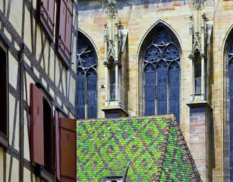 它的屋面做得很漂亮,是用彩色花砖砌成的几何图案圣马丁教堂位于科尔马老城的中心,是一座建于13、14世纪的哥特式教堂。它的屋面做得很漂亮,是用彩色花砖砌成的几何图案。