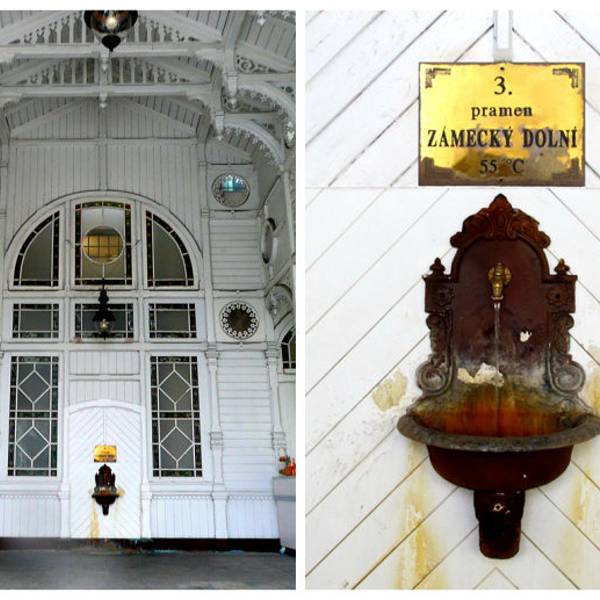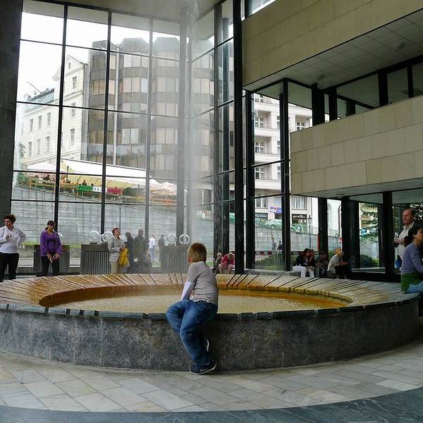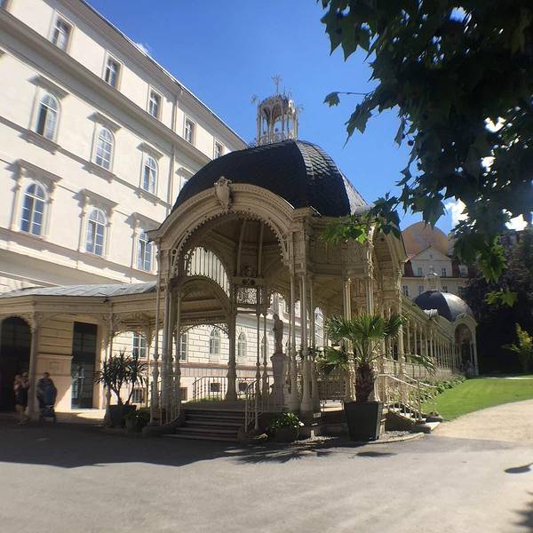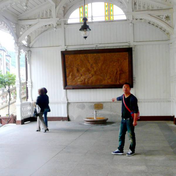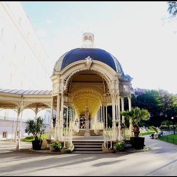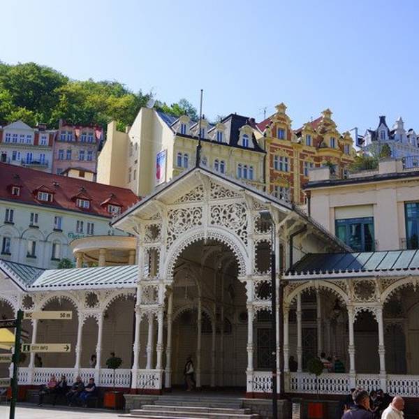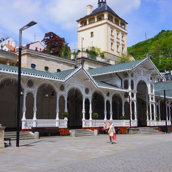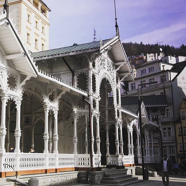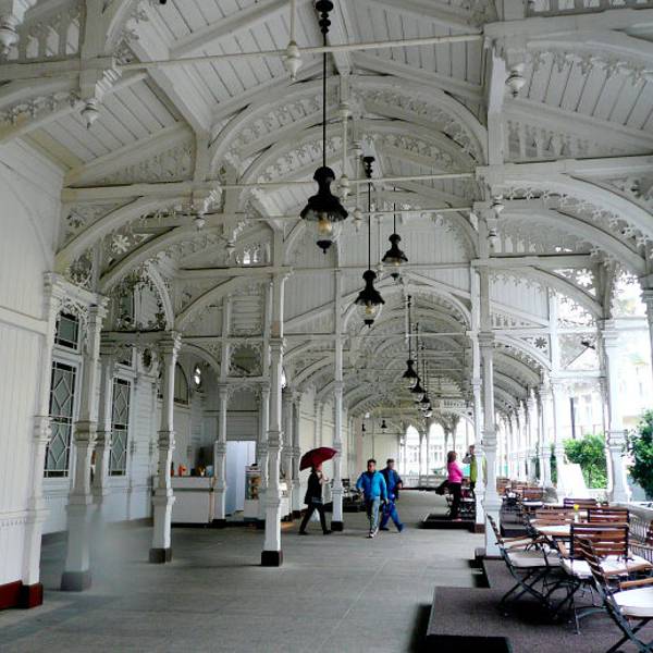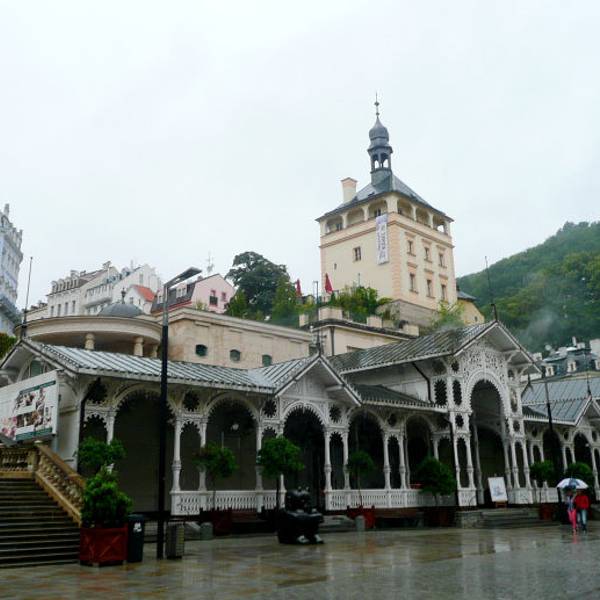 市场温泉回廊和公园温泉回廊同样走精致风,不过它采用的是瑞士木造风格,点缀着无数星芒状的雕饰。位于昔日市政府所在地的市集温泉回廊直到1993年才出现,取代1883年以前另一座由捷克著名设计师Fellner和Helmer设计的温泉回廊。如今回廊下方共有两处温泉出水口,其中位于描绘卡罗维发利发迹壁画下方的出水口,正是名为“查理四世”的温泉。回廊旁还有一座美丽的市集广场,这座迷你广场四周环绕着色彩缤纷的房舍,给人一种童话的感觉。