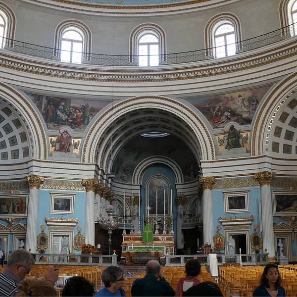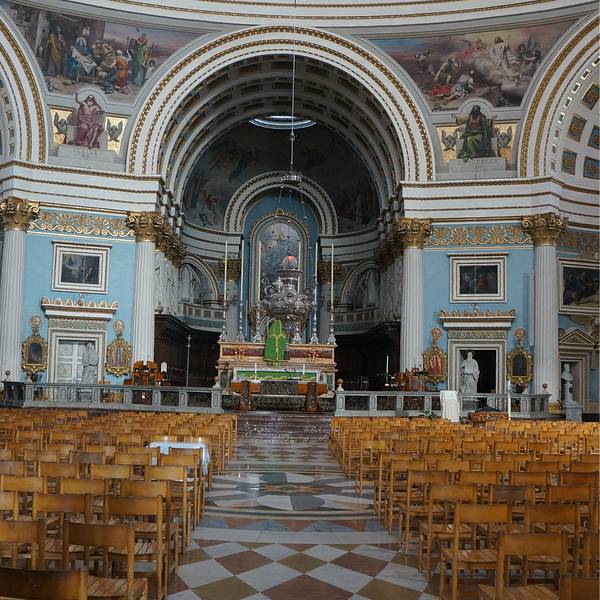 莫斯塔圆顶教堂建于19世纪中期,大概用了40年左右才建成,位于马耳他岛的莫斯塔镇。这座圆顶教堂拥有欧洲第三大的圆顶,这座圆顶教堂因其在二战中幸免于难,被游客和当地居民津津乐道。据载1942年4月9日的二战空袭中,一枚200公斤重的炸弹砸在圆顶上但是却并没有爆炸。因此,这座教堂又被一些人们认为是可以带来好运的教堂。