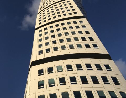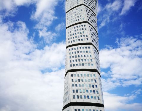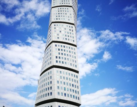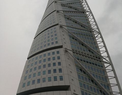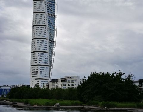 马尔默的旋转大楼是该市的重要地标之一,它的每一层楼都旋转了一点,整个大楼旋转了九十度。旋转大楼坐落在海边,从市区的每个角度都可以看到它非常的壮观。