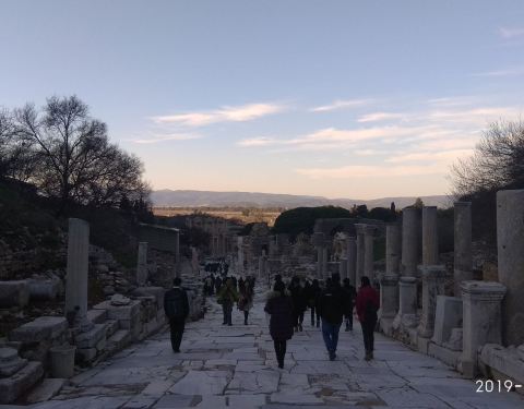 以弗所古城的一条曾经繁华之极的大街,周边教堂,浴室,房屋林立,地面的石路显示了城市的沧桑。毕竟有2000多年的历史,古罗马时期的辉煌展现期中。