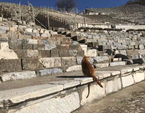 虽然已是残亘废墟,古城内无处不在的精美雕塑,还有随处可见的猫咪,使我仿佛置身于古代雕塑艺术的画廊里,又增加了一份情趣。赫拉克勒斯门前的胜利女神耐吉(Nike)的雕塑,雕塑十分精美,那飘逸的神态十分吸引人。据说是耐克公司以此为灵感创造了如今的LOGO造型