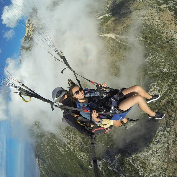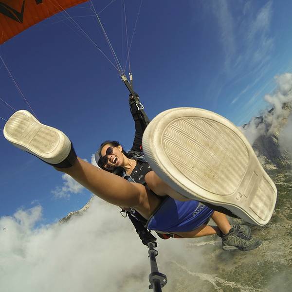 教练将背包里的滑翔伞拿出来整理就绪,给我们带上安全帽,背上背包,扣好安全扣,这个时候教练会交代好注意事项,然后就站在山顶悬崖边等着出发啦。一切准备就绪后,旁边的工作人员会推着我们助跑,紧接着一跳,我们就从2000米的高空飞下去了。