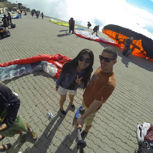 我们选择了信誉度最好的Gravity公司, 130里拉一个人,包酒店接送。坐滑翔伞之前最好不要吃太多东西,以免被转晕的时候吐出来。鞋子一定要穿紧一点的,见过很多穿拖鞋的,结果一上天,鞋子就被风吹走了。还有墨镜是必不可少的,否则照片拍出来,眼睛全是闭着的。