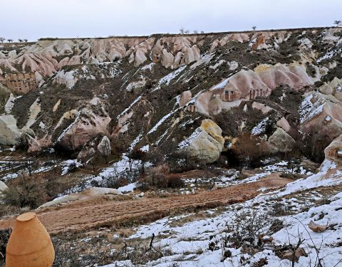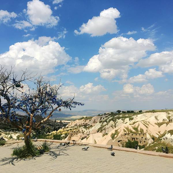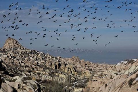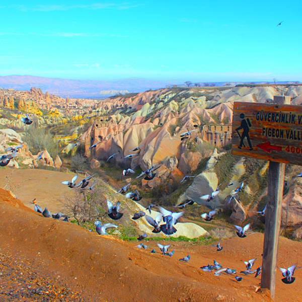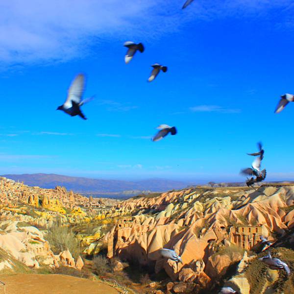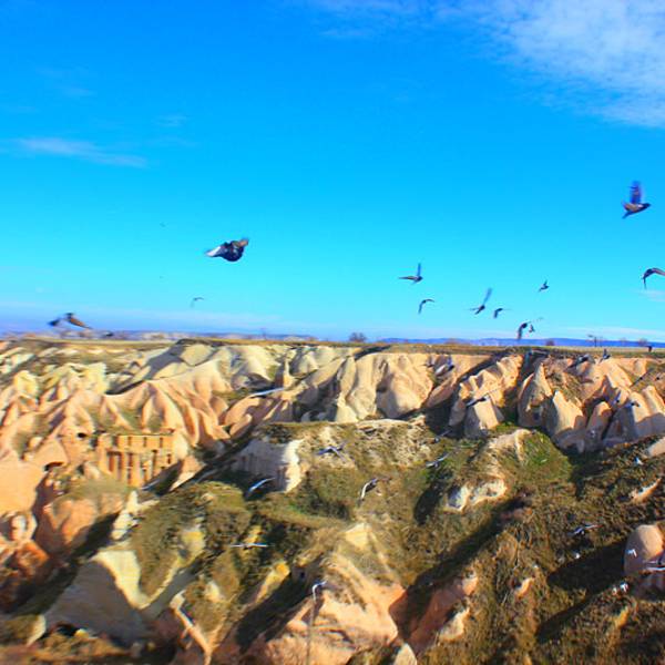 鸽子谷靠近乌奇萨(Üçhisar),因沿途彩色的鸽舍而得名。这个山谷里到处都是石头,石头上有许多密密麻麻的洞眼,走到跟前才会发现原来都是鸽子洞。若在傍晚时来此,有机会看到鸽子回巢的壮观场面。 这里有一片观景台,可以看到许多肥肥的鸽子在地上抢食物。旁边一般会有卖谷子的人,不妨花上1里拉左右买一把喂它们,但要小心被鸽子疯抢哦。 除了可爱的鸽子,附近还有一棵挂满土耳其传统附身符“蓝眼睛”的树,很有意思。此外,鸽子谷内也有很多石洞房间和通道可以探索,有点类似于乌奇萨要塞,只是台阶较少,攀登时依然需要注意安全。