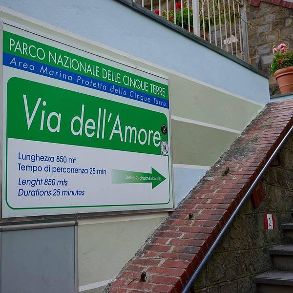 爱之路是连接马纳罗拉和里奥马焦雷的狭长小道,它是五渔村的徒步线路中较短也较适宜的一条,只需20分钟就能走完全程。路虽不长,但风景十分可人:一边是巨大的石壁和梯田,另一边则是悬崖峭壁,海水拍岸的声音仿佛就在耳边。爱之路原是为了两村之间铁路建设的工作需要而建,这并不浪漫的缘起却丝毫不影响它成为五渔村浓情蜜意的景点:密密麻麻的同心锁墙,刻满誓言的仙人掌叶,壁廊上的留言和涂鸦,还有迎面走来三三两两的情侣们,无时无处不表达着爱情的美好与魔力。雕刻成亲吻剪影的石椅是爱之路的标志,到此一游一定不能错过在此合影。