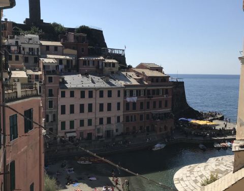 爬上阶梯虽然累,但这里的风景绝对值得!海水变成了湖蓝色,也把远处悬崖上的另一座渔村衬托得更加好看紧接着,天气在我们到达 Corniglia 时变得更好了。海水变成了湖蓝色,也把远处悬崖上的另一座渔村衬托得更加好看。Corniglia 建在了高高的悬崖顶上,有一段长长的阶梯连接着渔村和火车站。而在阶梯两旁,则是一些...紧接着,天气在我们到达 Corniglia 时变得更好了。海水变成了湖蓝色,也把远处悬崖上的另一座渔村衬托得更加好看。Corniglia 建在了高高的悬崖顶上,有一段长长的阶梯连接着渔村和火车站。而在阶梯两旁,则是一些虽然破旧但视野无敌好的海景房!这里游客众多,没素质的也不少,连仙人掌上都被刻了字。可虽然游人多,也还是有一些小动物栖居在此。比如那只毛色鲜艳、皱着眉头十分可爱的小胖鸟,还有那只勤劳地吸着花蜜的不明生物。爬上阶梯虽然累,但这里的风景绝对值得!穿过一条条幽暗的小路,路的尽头便是广阔无边际的大海。在小路的尽头有一个观景台,在这里,有本地人倚着墙壁聊天,也有游客坐在长椅上晒太阳休息,我们则像这个小朋友一样,坐在这个台子上得瑟了一下,景色虽美,但悬崖边还是太恐怖,马上就下来了!这时太阳已经完全露了出来,海面平静又一望无际,透出一种让人着迷的深蓝色,也给人一种宽厚、包容的感觉。4月的意大利已经鲜花盛开,而且开得十分热烈,就像很多意大利人一样友好又热情。其实无论大海的颜色怎么变幻,总还是摆脱不掉蓝色带给人的静谧忧郁的感觉,但这些花却不一样,无论出现在哪里都仿佛是点睛之笔,可以让整个画面一下子鲜活起来。返回火车站的路上,看到被阳光照得清澈透明的海水,竟然都觉得中午的暴雨有些不真实了。我们一边期待着日落,一边向五渔村最有名的 Manarola 赶去。 展开