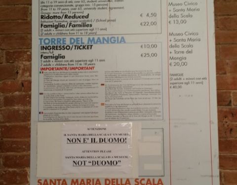 锡耶纳市政厅位于贝壳广场,由大楼和塔楼组成。其中一层庭院进门最里端用作售票,进门右侧为博物馆,左侧为塔楼入口,正门右边为剧院。参观博物馆9欧,登塔楼10欧,联票13欧,两大一小家庭票40欧送大教堂博物馆门票。