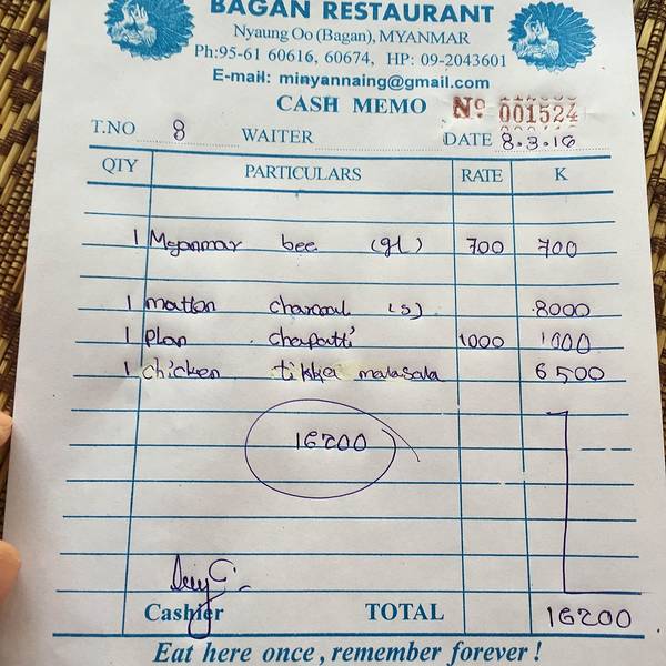 晚上,又用大众点评,找了家排名第三的饭店 A little bit of bagan食肉动物的我,在缅甸唯一的困难就是,吃不到好吃的肉 他们的咖喱做的肉,都是大块大块的死肉,一点都不好吃,也不入味 然后今天为了吃肉,点了个牛肉烤锅,照样不好吃 中国的面条还不错,意大利的PASTA也还不错,还点了个蔬菜沙拉,一个披萨 惊艳的是披萨很好吃 消费3.2W缅币,算比较贵的