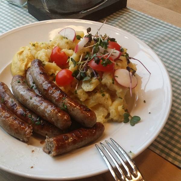 这时候少爷说饿了,是哦,一天没吃东西了。 于是决定去攻略上推荐的在老桥上的那家Alte Mainbrucke 享用美食, 貌似郁闷的心情只能用吃来聊表安慰了。从城堡下去,把车停在老桥旁边的一处地下停车场,步行前往,找了半天,标识不是很明显,就在老桥刚结束的门口,服务员谈不上热情,在德国的第一次点餐,有点费劲,最后连蒙带猜的点了小香肠和牛排,看到美食的一刹那,心里顿时阳光明媚啊,我是吃货有木有? 著名的小香肠,好吃哎还有牛排,也很美味望向窗外的美因河,突然有种不真实的感觉。如果是夏天应该可以坐到外面吧,景色应该会更好吧。(我总是想象夏天是啥样子,这是有多不满意冬天)