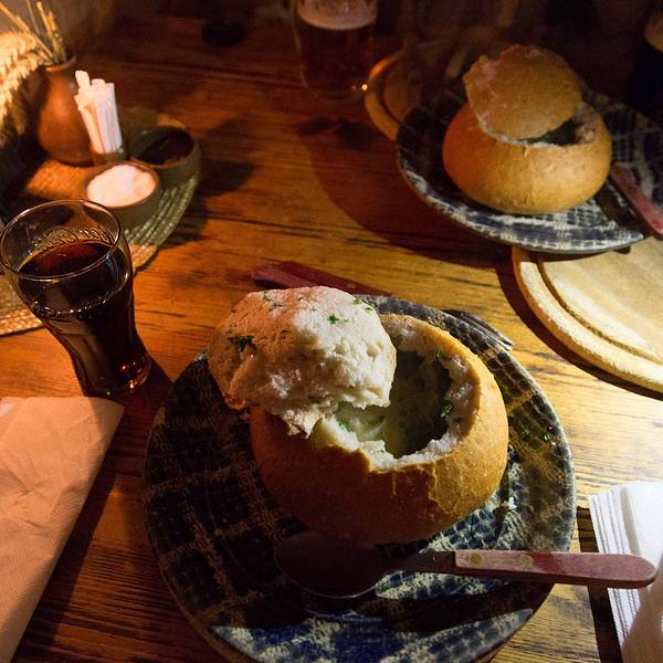 🍽推荐菜品:要说起捷克的美食,首选一定是大肘子!没错,在捷克猪肘餐是一道特色美食,而CK小镇最好吃的大肘子就在这洞穴餐厅里面,这里的烤猪肘外焦里嫩,肥而不腻!还搭配着一些酸菜,量很足,足足有1kg,价格也还算公道,一个完整的大肘子490捷克克朗,约合人民币130多!还有这里的蒜香面包汤,不仅卖相很好,而且是真的很好喝,汤里的芝士可以拉很长很长。要尽快的喝,不然汤很快会渗下去!