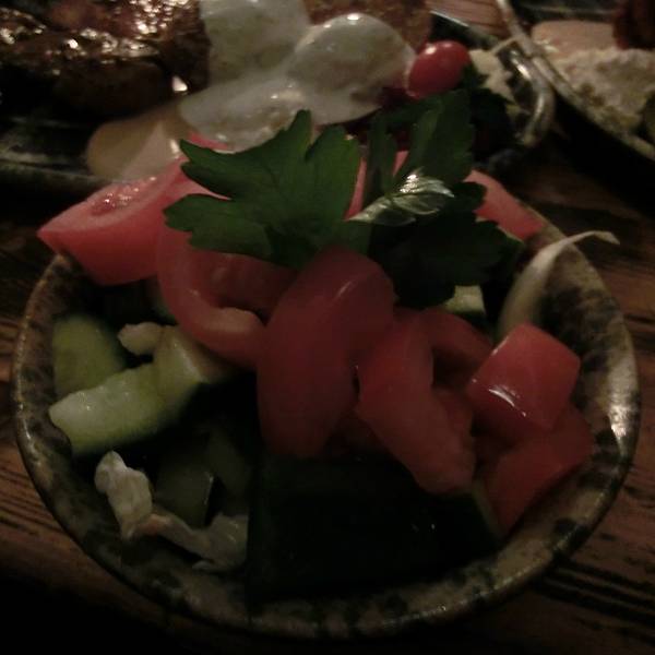 我们两个人点了一份蔬菜沙拉、一份大蒜汤和一份烤猪肘,最后撑得不行。