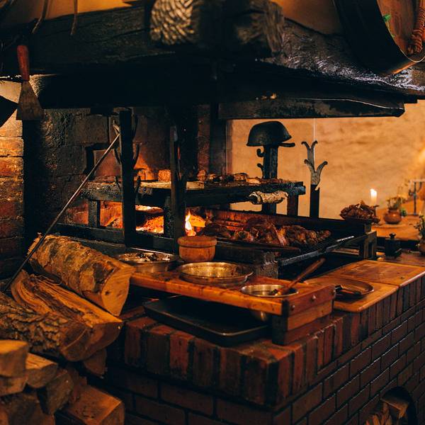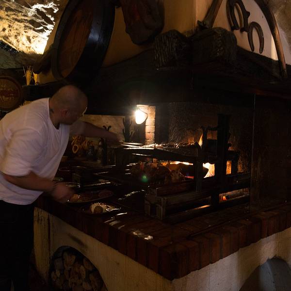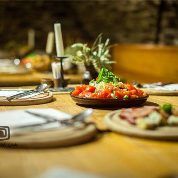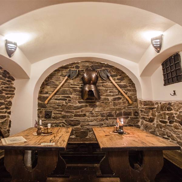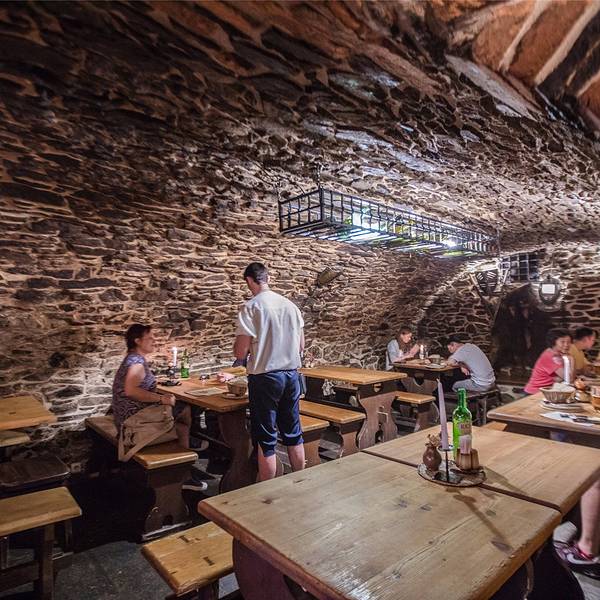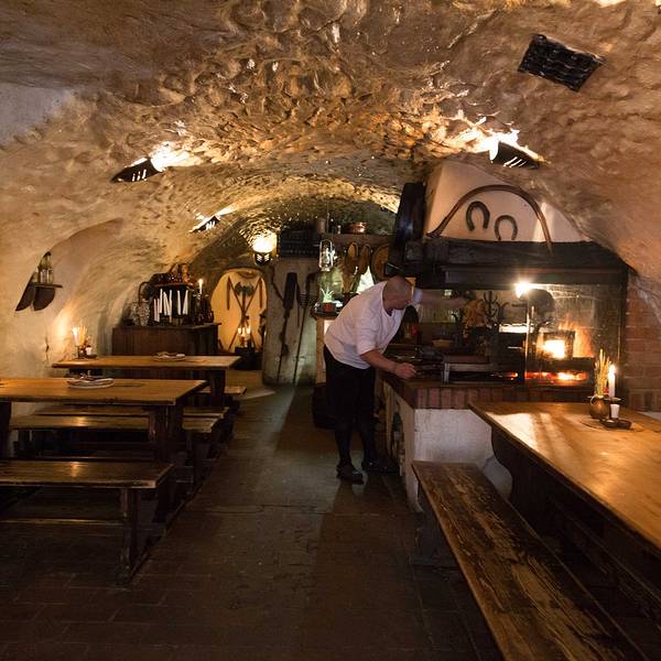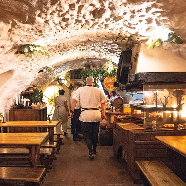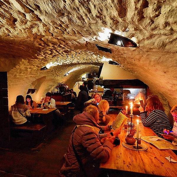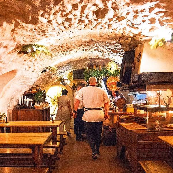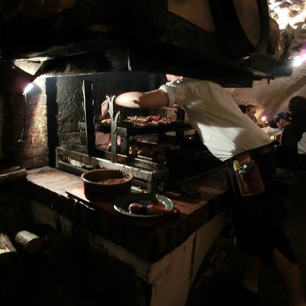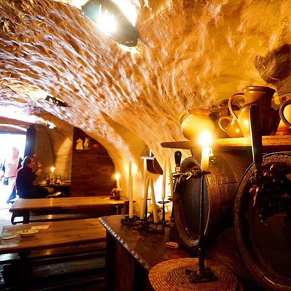 🖼餐厅环境:听名字就能猜到餐厅是建在类似防空洞的地方,但其实这里就是一处监狱旧址,拱形天花板,石头墙壁,座椅都是长条板凳。洞穴整体偏昏暗,但典雅的乐曲却为餐厅营造出欢快的氛围。里面虽然没有富丽堂皇的灯光,但内部装饰都别具风情,而且每张桌子上都点着蜡烛,又为这里增添了些许浪漫的气氛。在我们视野的正前方是巨大的烤炉和木柴,装饰的也很特别,当地非常有名的烤猪肘子,就是在这个烤架上做出来的。