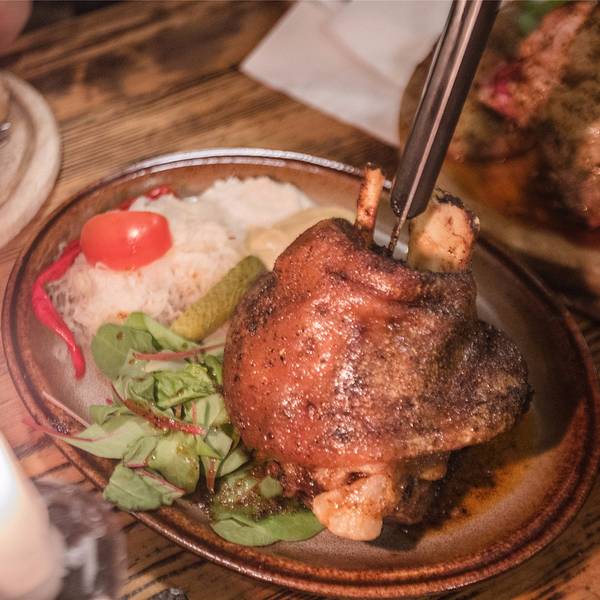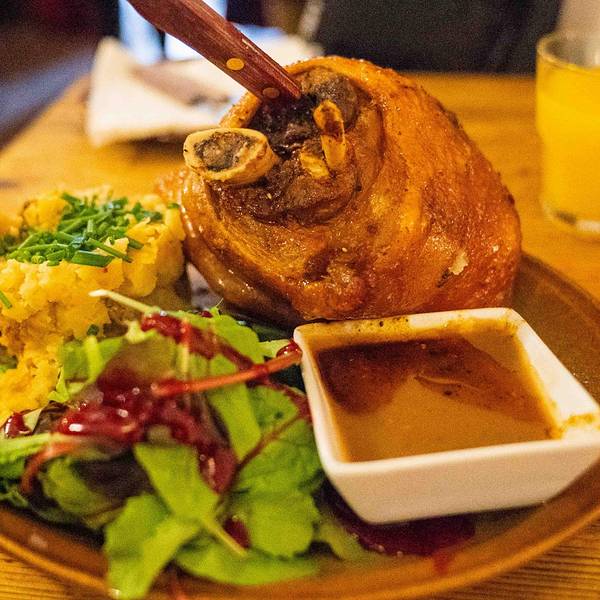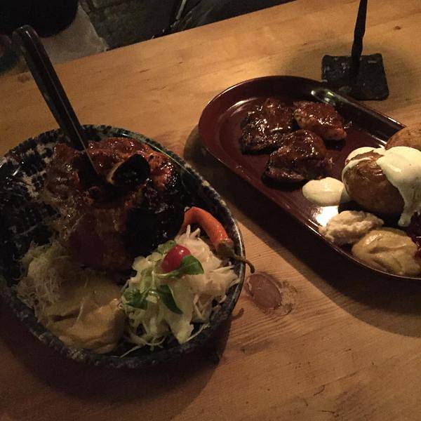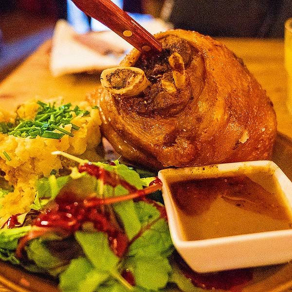- 一份烤猪肘子和一份肉饼之类的,总之是店员超级推荐的必点菜。地窖餐厅外的也是坐满了人。地窖餐厅入口