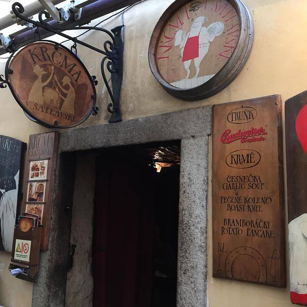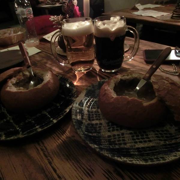 “Krcma v Satlavske Ulici”,当地著名的洞穴餐厅,貌似在中国人和韩国人当中非常有名,三个人点了啤酒、汤、肘子、香肠、烤鸭腿,合起来才80多欧元,还算是很实惠的。味道来说还算可以,主要是餐厅环境像是在洞...“Krcma v Satlavske Ulici”,当地著名的洞穴餐厅,貌似在中国人和韩国人当中非常有名,三个人点了啤酒、汤、肘子、香肠、烤鸭腿,合起来才80多欧元,还算是很实惠的。味道来说还算可以,主要是餐厅环境像是在洞穴当中,并且大部分菜肴都是在炉子中直接火烤的。