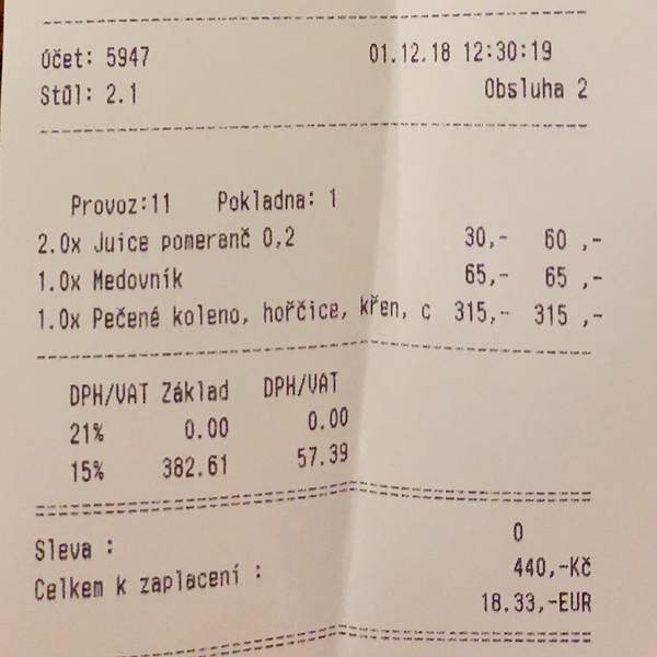 餐馆最经典的便是传统洋葱面包汤和各式烤制的猪牛鱼肉。但是餐厅最出名的主菜就是猪的各种部位予以烧烤,炉子就设在进门后的就餐区内,一派热火朝天,奇香扑鼻,让人食指大动。大肘子烤的外焦里嫩恰到好处,也就7欧左右实在是太便宜了。另外它家的黑啤入口即化,真没喝到过更好喝的!只是服务员态度很捷克……不冷不热的,感觉你来不来无所谓,有几个负责烤肘子的小哥还比较热情,小姑娘嘛普遍冷艳高贵。