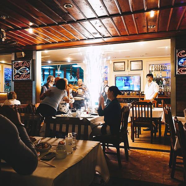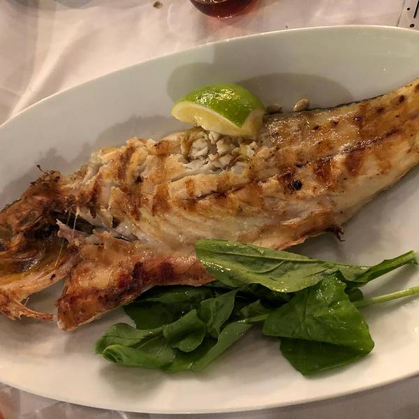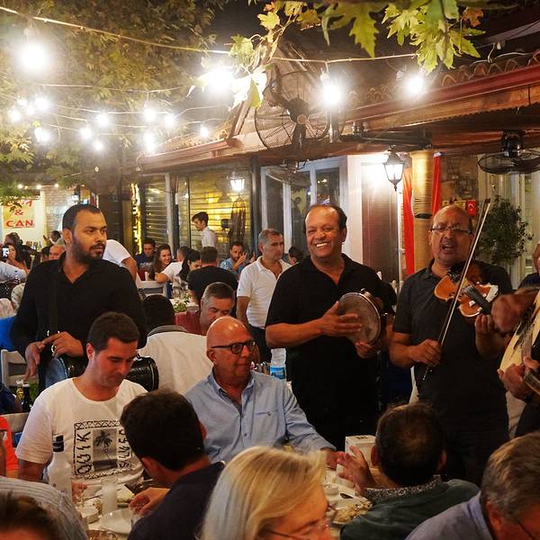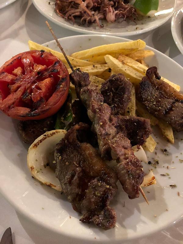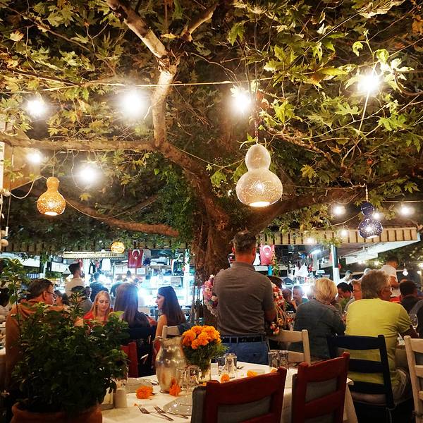 买完票özgür把我们送回镇上,我跟Rainie去了鱼市吃晚餐。鱼市挺好找的,外面的店有些都关了,但是一进到鱼市,果然很热闹~在里面想拍张热闹景象,一拿起相机就有人招呼你给他拍一张。。有个大爷一直围着我转,隔一会就过来一趟要我拍他,最后我也是耐不住给他拍了一张,还没对上焦哈哈。。 鱼市中心是鱼摊,周围是餐厅,正常的点菜流程是选好餐厅,问好价钱之后让餐厅去买鱼,或者你跟着餐厅的人一起去选鱼。我之前也没怎么仔细看攻略,倒是记得中间的鱼摊只卖,不加工,都是买好了之后给餐厅加工,但是顺序没记住哈,我们进来就直奔鱼摊就去了,选好了要的东西之后,付完钱,鱼摊老板随手指了一个站在空地上的小伙子,说他会帮我们做。然后这个小伙子让我们选座位,说再给他10TL,我不明白为什么,他英语也不利索,又叫了另一个厨师过来解释完了我才知道我们的流程反了哈,所以也就是说鱼摊那个老板的随手一指,就已经是帮我们选了餐厅😂而且也不能干吃海货呀,得点点菜和喝的吧,这些都是要付给餐厅的,前面那个小伙子问我要的10TL是加工费。我跟Rainie午饭吃得太晚,这会也不太饿,就点了几个凉菜,其中厨师推荐的那个茄子肉末的凉菜挺好吃~ 这里会开到23:00,所以慢慢吃刚好碰到一家过生日的
