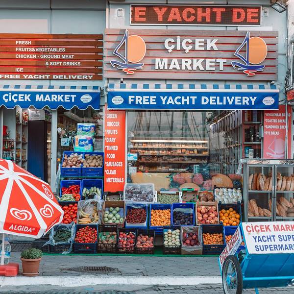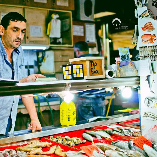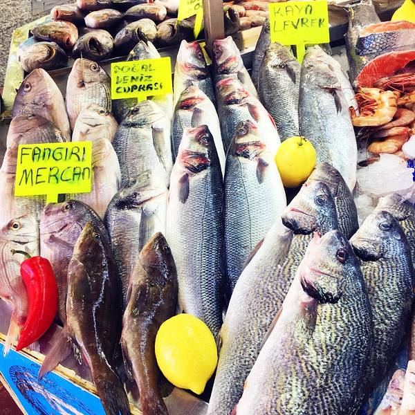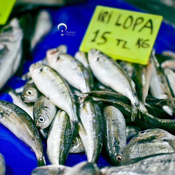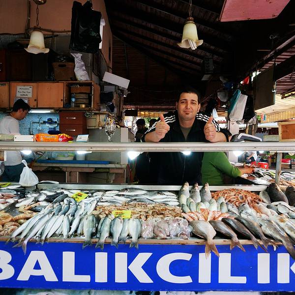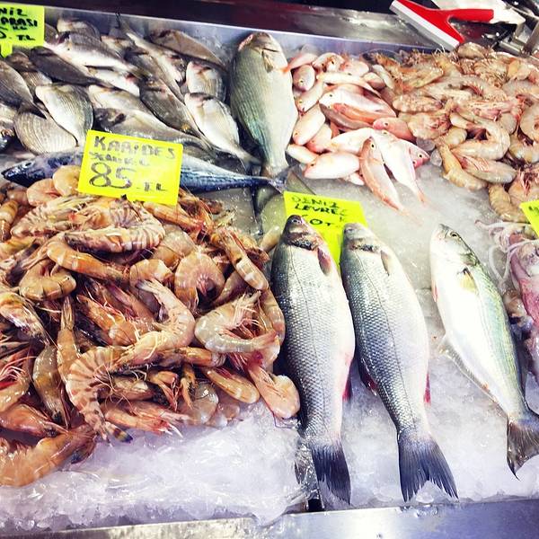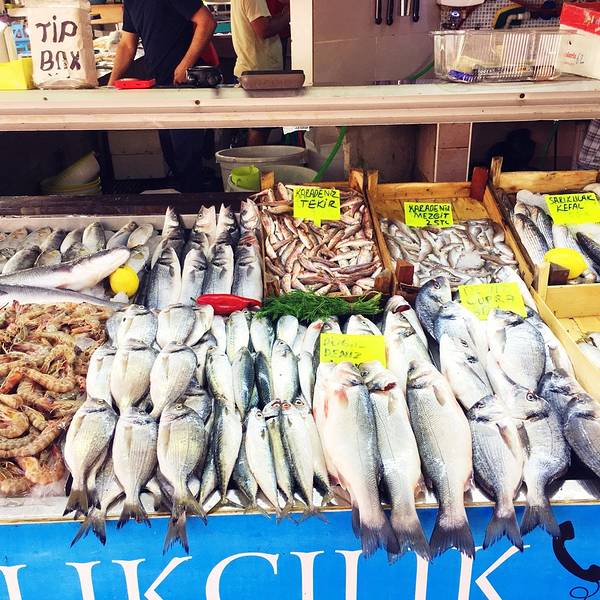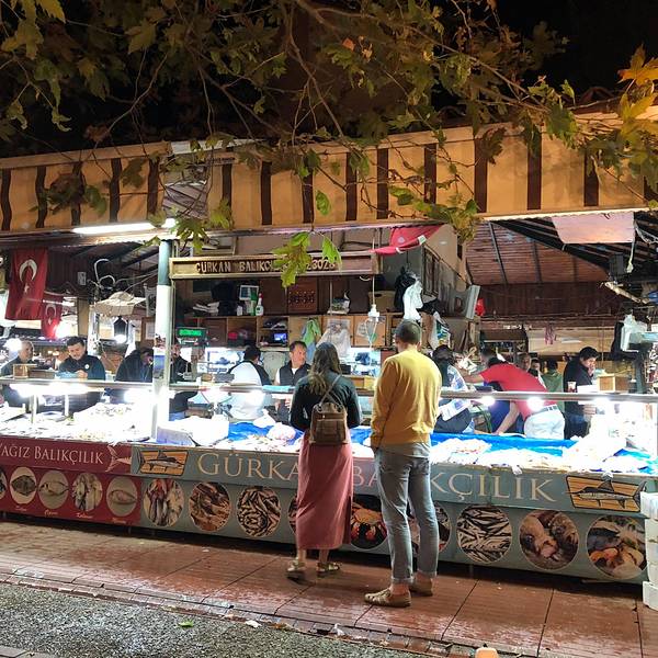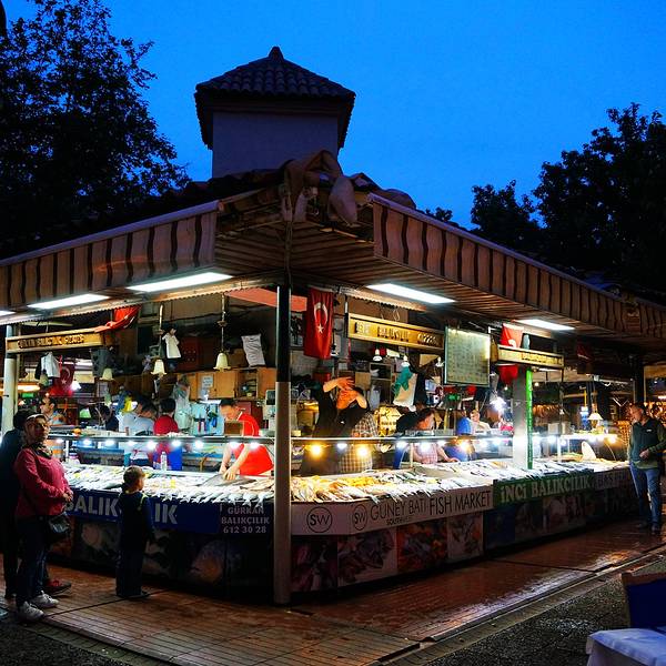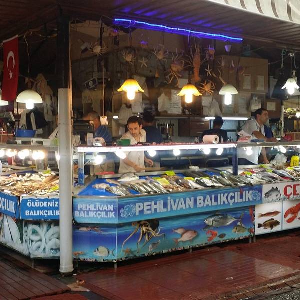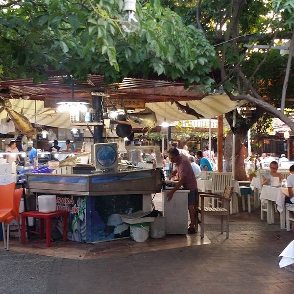 有诸多新鲜海产品可选,不过种类没几样,每个摊位东西基本都是一样的。饭店本身海鲜不提供,都是先有个座位,带你去自家熟悉的铺位挑选,然后付完钱后送到店家烹饪。还有流动的表演人员,可以请他们为你演奏上一曲。不过不要期望太高,土耳其人烧海鲜水平一般,还是广东人会烧啊!海鲜市场旁连接着一个菜场,瓜果蔬菜的丰富程度倒是比海鲜高。来点水果和各类礼品倒是个好地方。