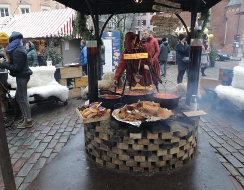 而市场的大棚是由五个德国旧齐柏林飞船飞机棚,添加了新古典主义和装饰艺术风格。市场面积达72300平方米,大约有3000个摊位,从蔬菜水果、鸡鸭鱼肉到奶酪、蜂蜜、锅碗瓢勺、五金百货等等,一辈子生活所需,基本都可以在这里搞定。只有在这里,才能更加透彻的了解里加人民的日常生活。市场里非常受欢迎的甜甜圈也是一定不要错过的,现炸现卖的小档口排满了人,而且价格也实在是实惠至极。小吴的晚餐就在市场里的小餐厅解决了,一份咖喱牛肉套餐只需要1.95欧,相比城里的餐厅来说简直是白菜价了。这一餐是目前为止小吴这一路上吃到最经济实惠的晚餐了,而且就味道本身来说也可圈可点,因为市场内本就不缺各种新鲜食材,各种调料(包括中国的五香粉)也一应俱全,热乎乎的米饭更是让我食指大开。