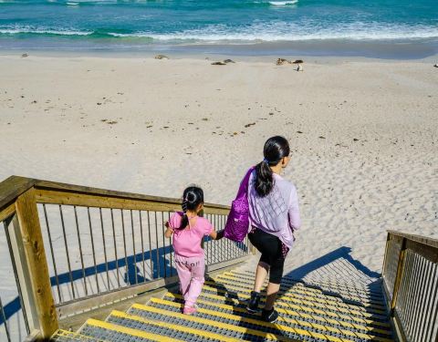 这会儿的我们是被他们参观的对象了,我们在固定范围内,而它们是自由的近距离观看这些海中的庞然大物。工作人员把我们带下海滩沙地,但是不允许我们再向前走,只能站在台阶下,看了一会儿回程的路上,碰到一只海豹散步,我们一群人只能等它一摇一摆的走下去,我们才得以通行