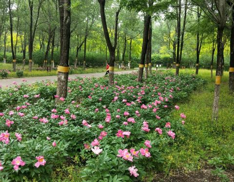公园人少景美,是一个清静宜人的好地方。还有大片的粉色芍药绽放在树丛中