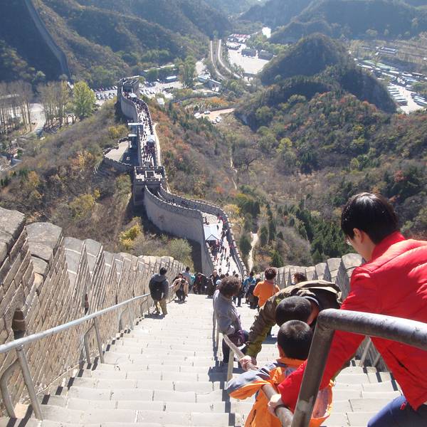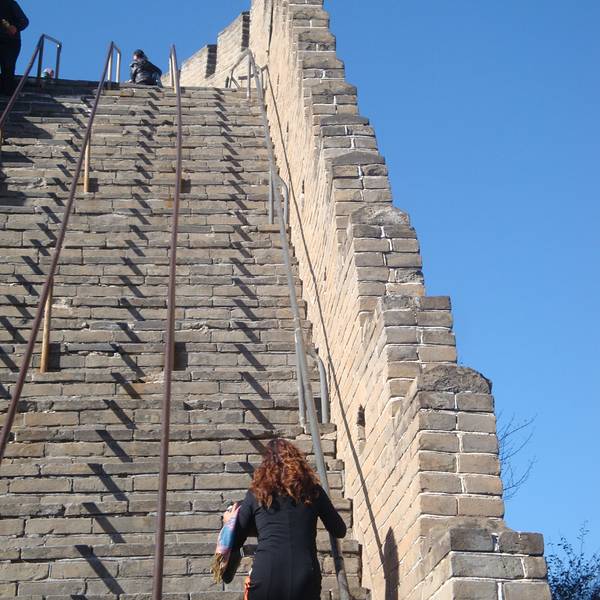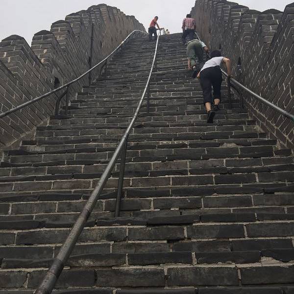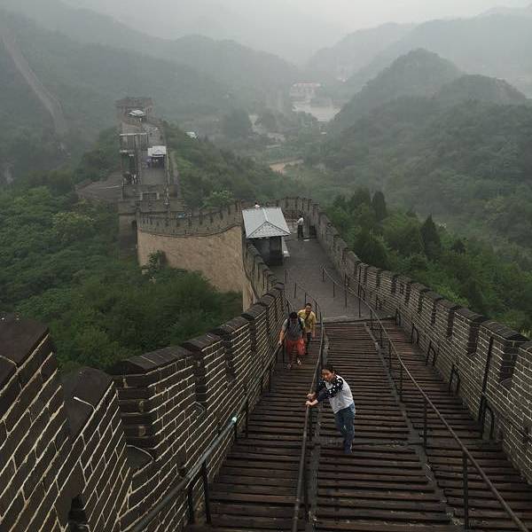 刚才说了,水关长城的台阶很陡很陡!如果不借助两边的栏杆扶手,不论上升还是下降都是很危险的。