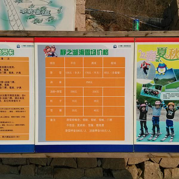 实用 静之湖滑雪场实际上指的是静之湖度假酒店的滑雪场,它位于昌平区兴寿镇桃峪口,在静之湖度假酒店的后山脚下静之湖滑雪场实际上指的是静之湖度假酒店的滑雪场,它位于昌平区兴寿镇桃峪口,在静之湖度假酒店的后山脚下。这里三面环山,滑雪场面积比较大,有初、中级雪道2条,中级雪道设有两入口,雪道顶部和中部,可乘地面...静之湖滑雪场实际上指的是静之湖度假酒店的滑雪场,它位于昌平区兴寿镇桃峪口,在静之湖度假酒店的后山脚下。这里三面环山,滑雪场面积比较大,有初、中级雪道2条,中级雪道设有两入口,雪道顶部和中部,可乘地面拖牵缆车前往。雪道的垂直高度不是很高,坡度较缓,滑雪场配有进口雪具1000余套,有专业滑雪教练指导,教练很有耐心,不会滑雪的人,一般滑上两三个小时,也就会了。滑雪场里有餐饮供应,价格比较实惠。值得推荐的是:来这里滑雪场滑雪的人很少,雪道较缓,特别适合初级和不会滑雪的人,滑雪场边的山坡上,植有很逼真的假桃花树,给萧索的寒冬,增添了一道亮丽的景色。滑滑雪,看看艳丽的桃花,可以休息眼睛。要注意的是:滑雪最好戴太阳镜,在雪地里滑雪时间长了,眼睛很不舒服,墨镜可以降低不适感,还有滑雪时身体要前倾腿微弯曲;往前走或走上坡,呈外八字,停下来呈内八字,然后打横,滑雪场里面没有免费水供应,建议自带,因为紧张加大运动量,容易口干,值得一提的是,滑雪场平时人超级少,如果您不是周末去的话,就可能是您的专场,您说美不美?游玩时间:4小时。