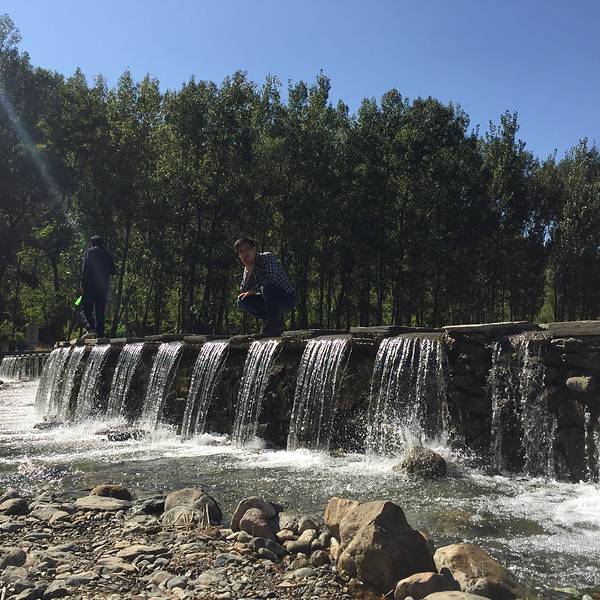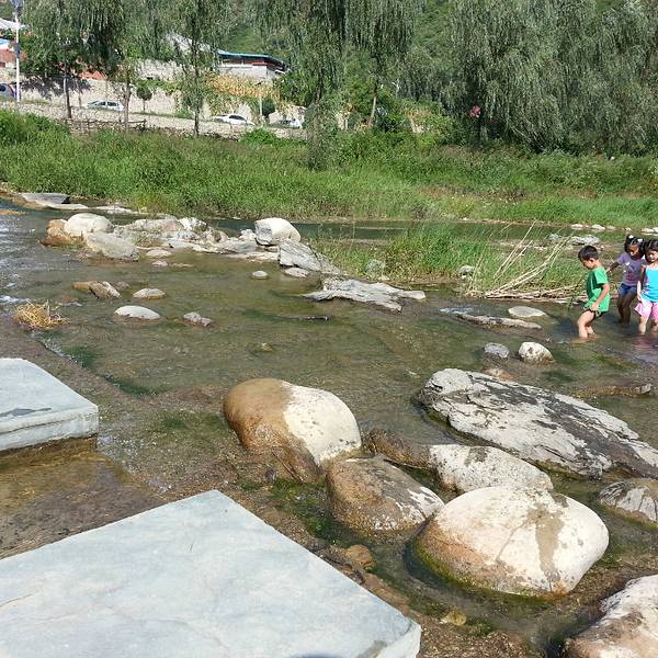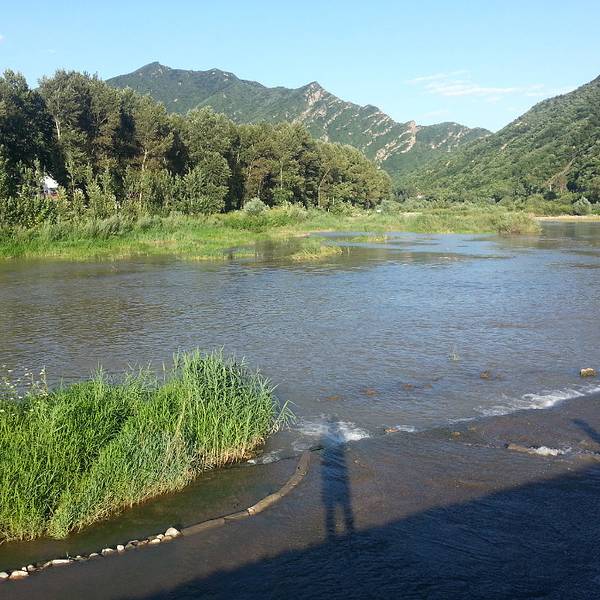 沿着河岸修有栈道、木桥、小亭、以及穿过河流的滩石,也是十分的清秀。站在上面极目远眺,山水草亭浑然一体北京怀柔有一个叫白河湾的地方,那里有一条沿着山谷而行的河水,山谷里的河水漫延开就形成了湿地。从进入白河湾一直往里有许多公里,公路旁就是那条河流,河畔就是湿地。