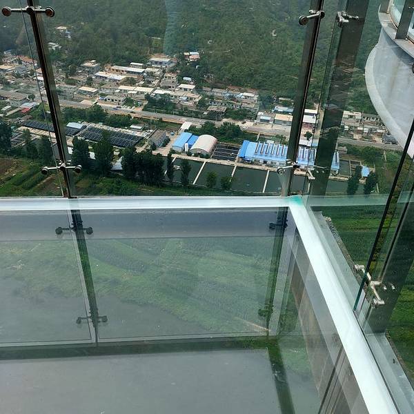 可惜这玻璃栈道的围栏玻璃是橘黄色的遮挡住了视线,恐惧感降低了很多,仅仅是脚下的透明玻璃就没那么刺激,真是如履平地了。