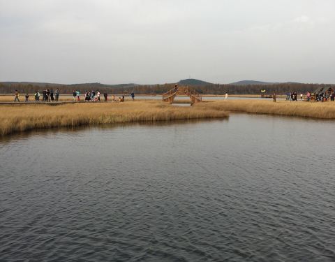 七星湖公园如今通为一体,大面积野花遍地的水草滩,虽是活动的浮层,但其底层仍是湖水,湖面上是相联...七星湖公园如今通为一体,大面积野花遍地的水草滩,虽是活动的浮层,但其底层仍是湖水,湖面上是相联的流动整体。为了保护湖的天然性,上面架了木制浮桥,并建立了木屋。