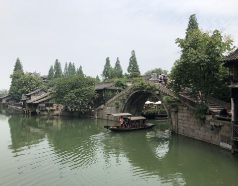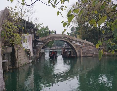 这儿是西栅大街的尽头,也是行船的终点。往...行至桥里桥,一边儿是仁济桥,一边儿是通济桥。这两座成九十度直角互相依偎着的石拱桥,因为可以从其中一个桥洞看到另一座桥而得“桥里桥”之名,是乌镇的一大景点。