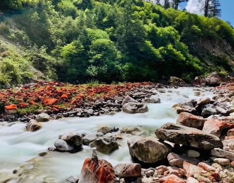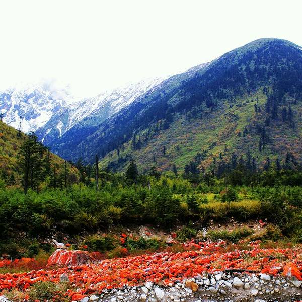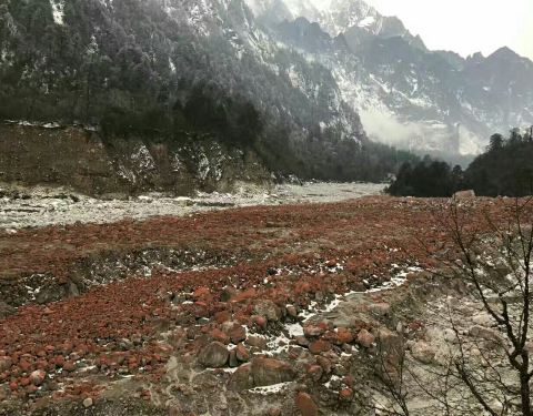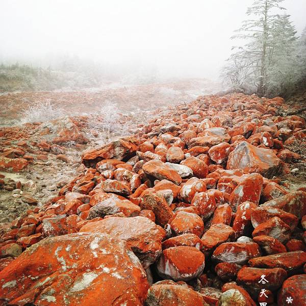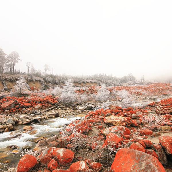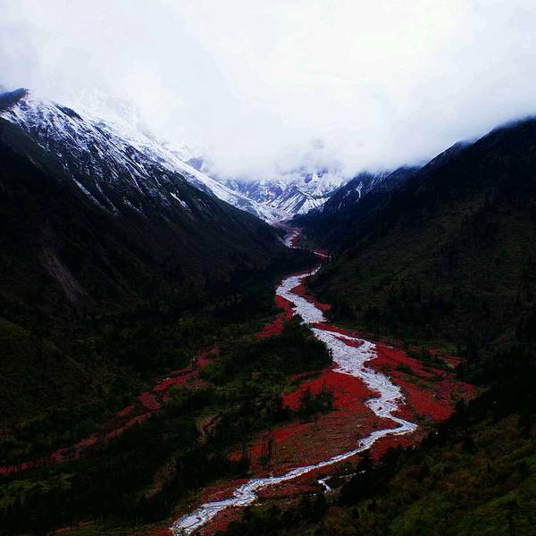 非常独特的地质景观,这里的石头上敷着着一种当地特有的真菌,使沟内的石滩呈现出成片的红褐色,与周...非常独特的地质景观,这里的石头上敷着着一种当地特有的真菌,使沟内的石滩呈现出成片的红褐色,与周边的雪山、森林一同构建了美丽的风景(可惜当天天色不佳,否则更加漂亮)。