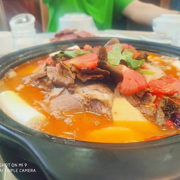 为了节省时间看完日落后,我们决定在川主寺解决晚饭~牦牛肉汤锅终于可以安排上了(¯﹃¯)说起对松潘美食的印象,大家最先想到的就是古城街上,四处烟雾缭绕,一元一串的牛肉串。然而牦牛肉串只是开胃小菜,松潘的特色是“牦牛肉汤锅”,牦牛肉汤锅的汤底是牦牛骨熬出来的,吃肉前先喝了一碗原汤,能感受到非常浓郁醇厚的鲜味,一个是牦牛肉的肉香,另一个是野生菌的鲜香。在这种高海拔地区,尤其是吹过零下温度的风后,喝下一碗汤,瞬间暖到心里。