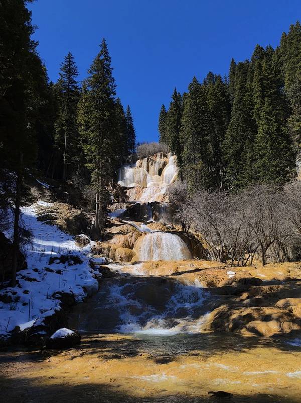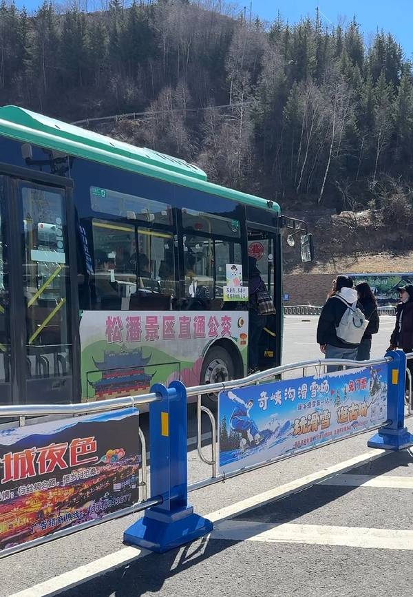 前往古镇填饱肚子后可以选择两种方式前往牟尼沟景区,游客中心乘坐大巴往返人均40元或包车前往,人多包车性价比更高,可以与司机协商价格。从松洲古城前往牟尼沟景区约1小时车程,抵达牟尼沟风景区扎嘎瀑布。