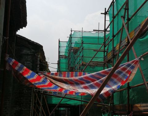 东华里在岭南天地的最旁边。岭南天地中一路有身穿制服的保安,一路问过去,一路的指点,其中有几个都不无遗憾地告诉我:拦起来了,外面看不到。果然,只能看见广告上面零星地探出几个镬耳屋墙头,交代着自己的岭南特色。