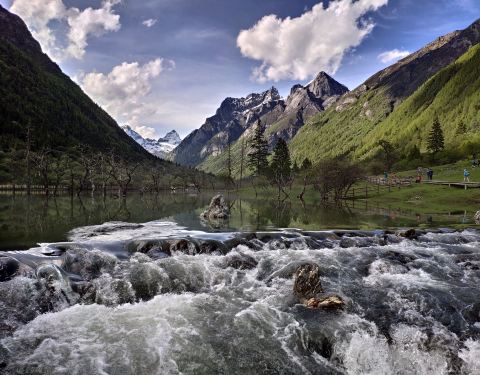 枯树滩位于四川省小金县四姑娘山景区内,枯树林立,在湖水中倒映成影,英姿飒爽枯树滩位于四川省小金县四姑娘山景区内,枯树林立,在湖水中倒映成影,英姿飒爽。湖水中周围山峰倒影清淅,晴天时兰天白云漂荡水中,雨后的山腰雾气在水中时映时隐,雨中湖水波动。