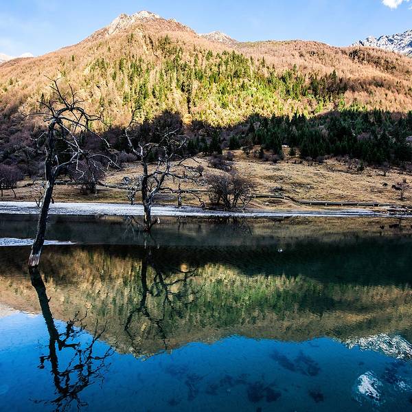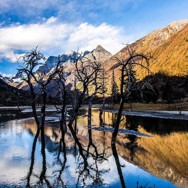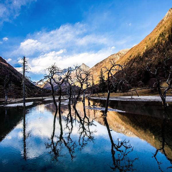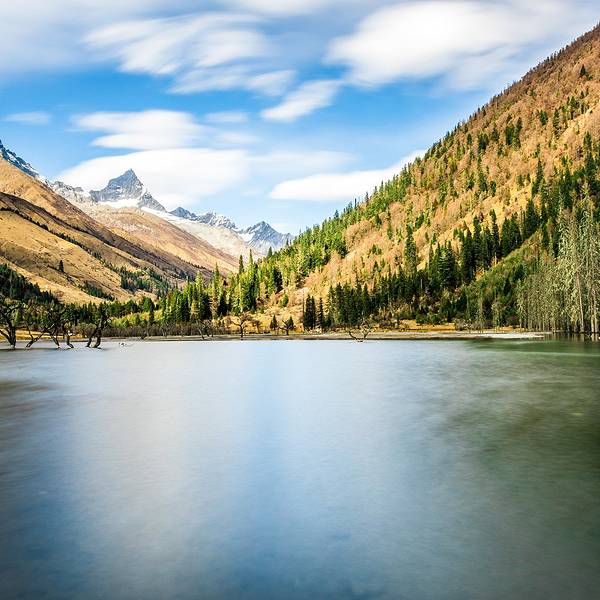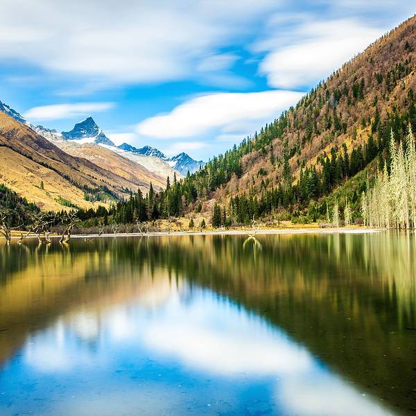 另外,布达拉峰观景台旁有很多卖烤羊肉串一类的,味道还不错,还有烤松茸,不知真假,就味道来说,肯定和鲁朗的松茸差别巨大。再往下走,到了一个小湖,名字忘记了。刚到的时候,云层还挡着太阳,站在观景台上,感觉一般。不过我知道,高原的云层一会儿就会被风吹走,再说等待是摄影的常态,大多风景都是等出来的。于是,架好脚架,上好ND,时刻准备着来张长爆,大约半小时后,云层移去,阳光出来,洒在湖面上,倒影尽显,美不胜收。心中自然也为刚刚匆匆离去的人们感到惋惜,我们在城市里匆匆,出游也匆匆,殊不知最美的景色可能是需要等候的,最美的结果也是需要努力后才会出现,走马观花只能是来过,绝不是领略过。乘车到了盆景湖,看到夕阳照在山上,印在水里,心中莫名的开阔,找好机位,来上几张。由于,五色林等景点叶子已经调去,也就没过多拍照,我想十月底应是色彩斑斓吧。出双桥沟的时候已是六点过,按照计划,我们去到长坪沟对面的长坪乡休息,条件还是不错。