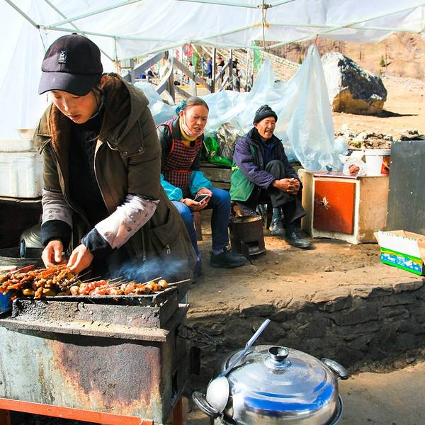 包含再四姑娘山双桥沟的门票里拉这里没有饭吃,但是有很多家这样子的烧烤摊,每家味道都差不多,可以随意选择一家吃。烧烤有牦牛肉3元一串。