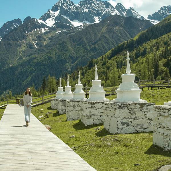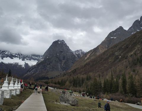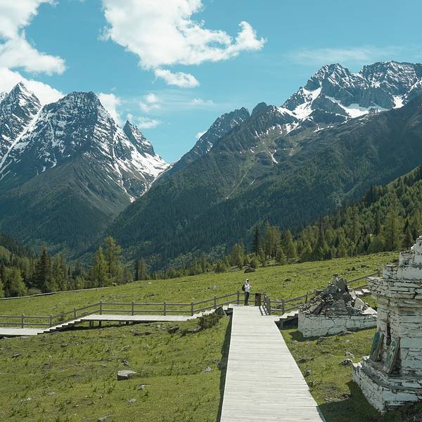 在阳光下,那悠长的木板...布达拉峰海拔5240米,它的确和布达拉宫有一定的关联。布达拉宫的灵感就是源于这座山峰。其中有一座山名叫金刚山,形状像牛心一样,当地人又称它为牛心山。白雪皑皑,远远看过去蔚为壮观。
