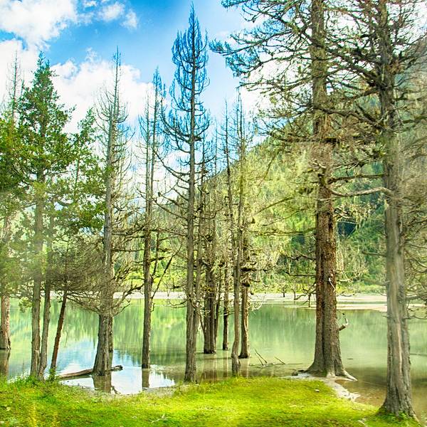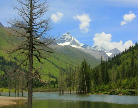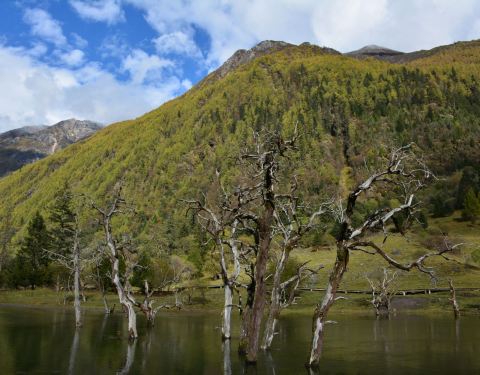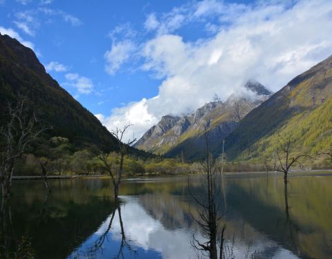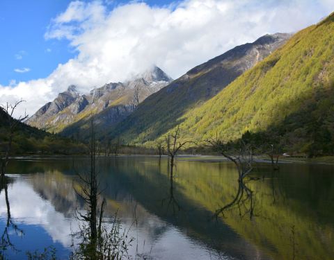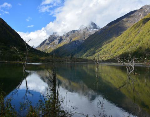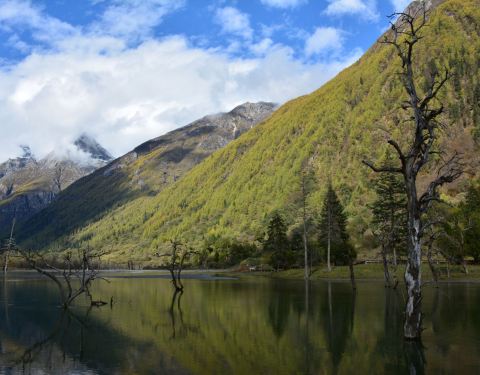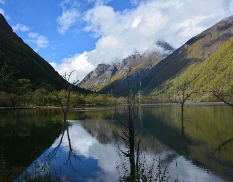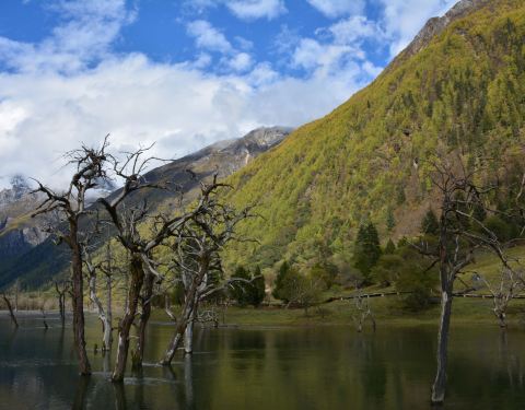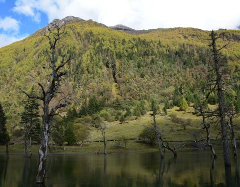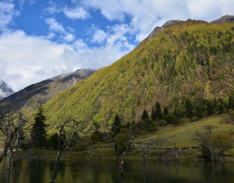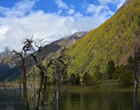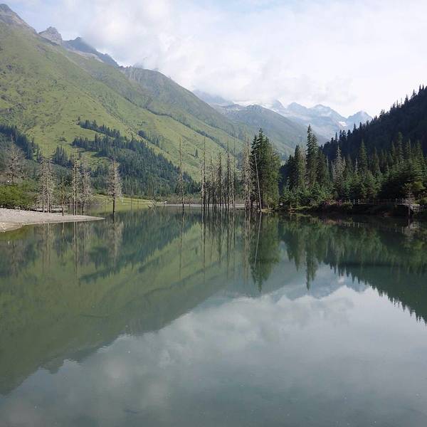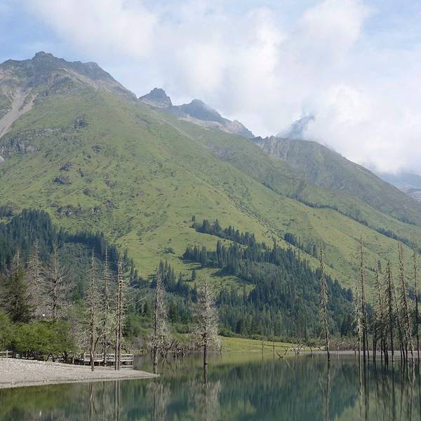 四姑娜措现在是是双桥沟最值得逗留的地方,碧绿的湖面,有着清澈的湖水。在绿绿湖水中沐浴着千年枯木四姑娜措现在是是双桥沟最值得逗留的地方,碧绿的湖面,有着清澈的湖水。也许512大地震唯一的贡献,就是布达拉峰上滚落下来的石块截断了双桥沟的小河,形成了堰塞湖。这个湖便是眼前的四姑娜措。再变换个角度又是...四姑娜措现在是是双桥沟最值得逗留的地方,碧绿的湖面,有着清澈的湖水。也许512大地震唯一的贡献,就是布达拉峰上滚落下来的石块截断了双桥沟的小河,形成了堰塞湖。这个湖便是眼前的四姑娜措。再变换个角度又是另一番景象。白云仙子在蔚蓝的天幕上尽情地展示着自己的72变,投射在山坡形成明暗不一的光影,浅绿色的草地看上去给人一种温柔之感,墨绿的冷杉林让人感到一种成熟深沉之美,介于两者这间的灌木,它的绿就像一种由浅入深的过度。这样深深浅山下的四姑娜措也有了不同的光影效果——黄的如初春的杨柳,绿的似翡翠。在绿绿湖水中沐浴着千年枯木。可能是上天眷顾使它们枯而不倒,倒而不朽。在这里静静地欣赏,见证大自然的沧桑变幻。 展开