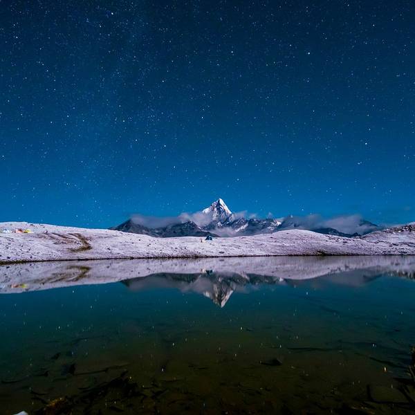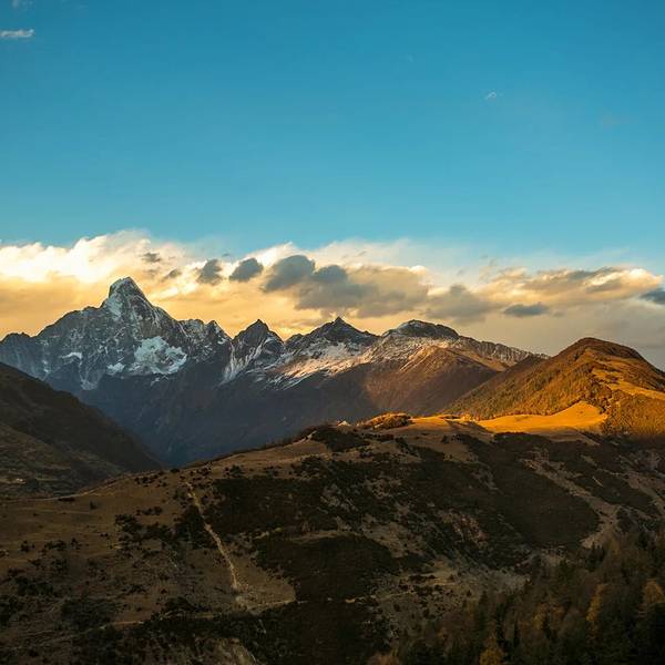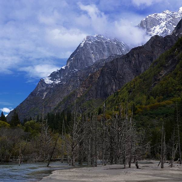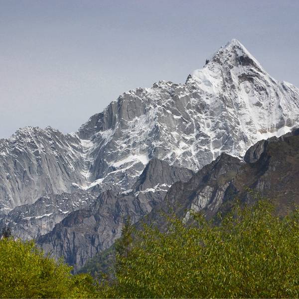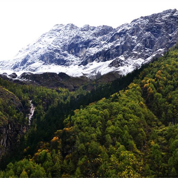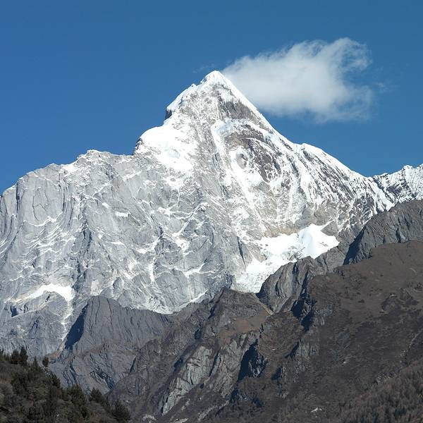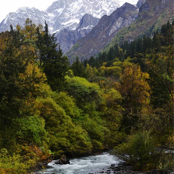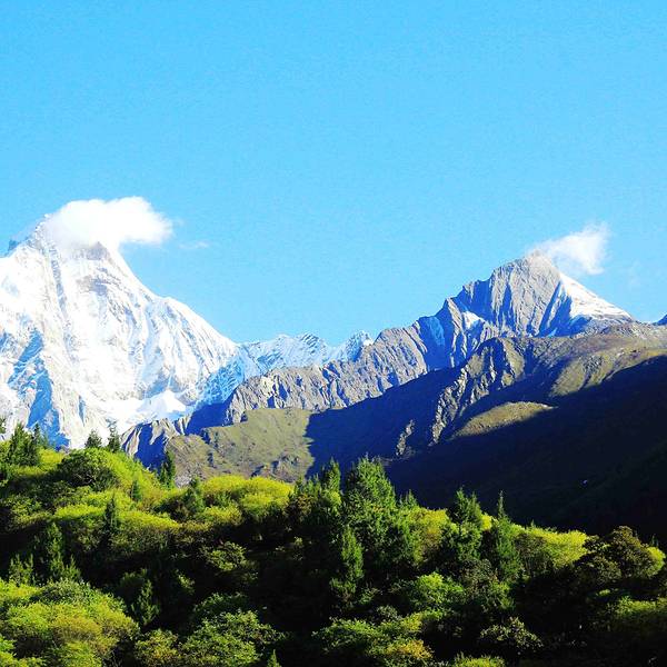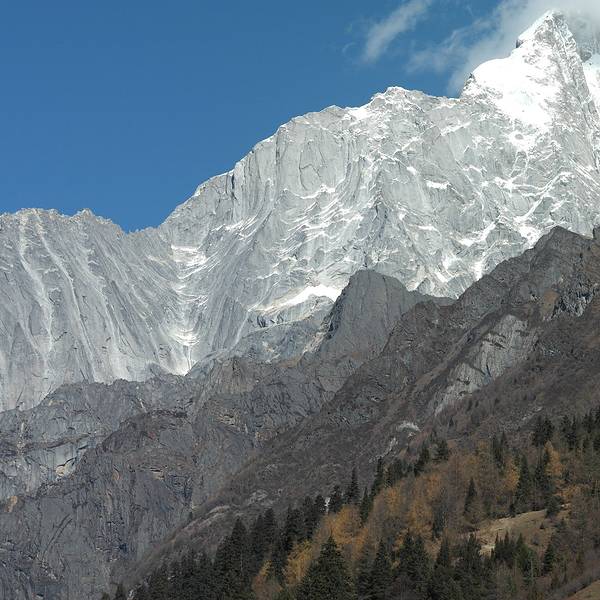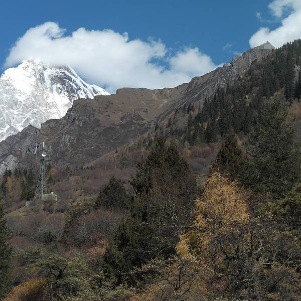 幺妹峰,海拨6250米,位于四川阿坝州小金县与汶川县交界处,是四姑娘山主峰。山体陡峭,终年积雪,直指蓝天,冰雪覆盖,银光照人,蔚为壮观。而每当金秋,幺妹峰树叶转红,又是一番景色。