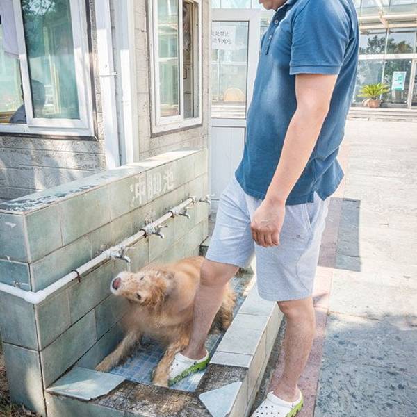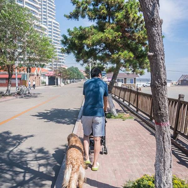 我们推着腕儿,溜达着去了附近的天马广场,晒晒太阳。这天气对人来说不太热,对三元来说还是太晒了