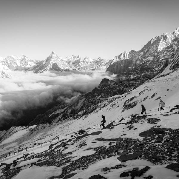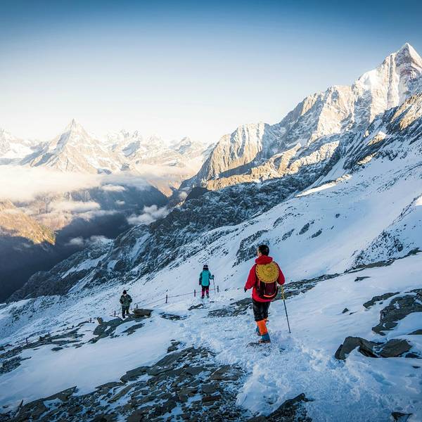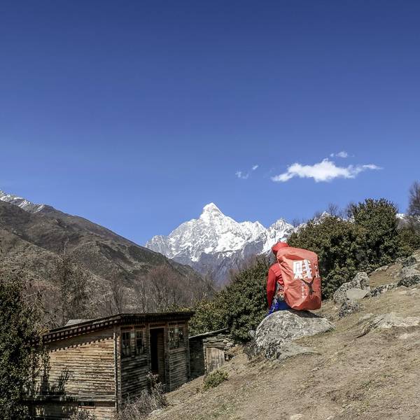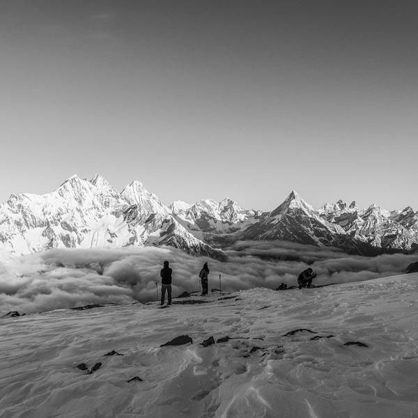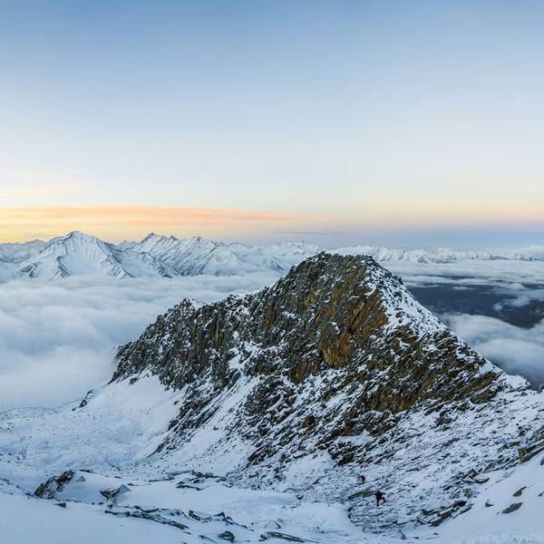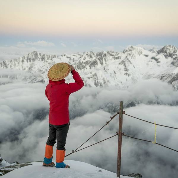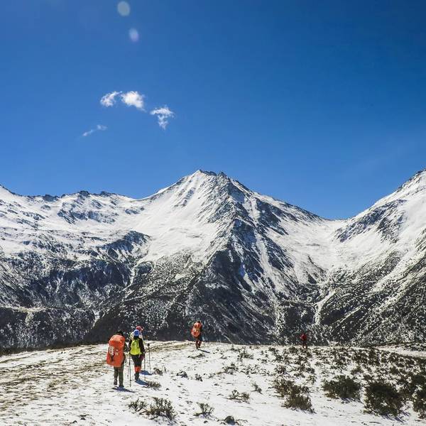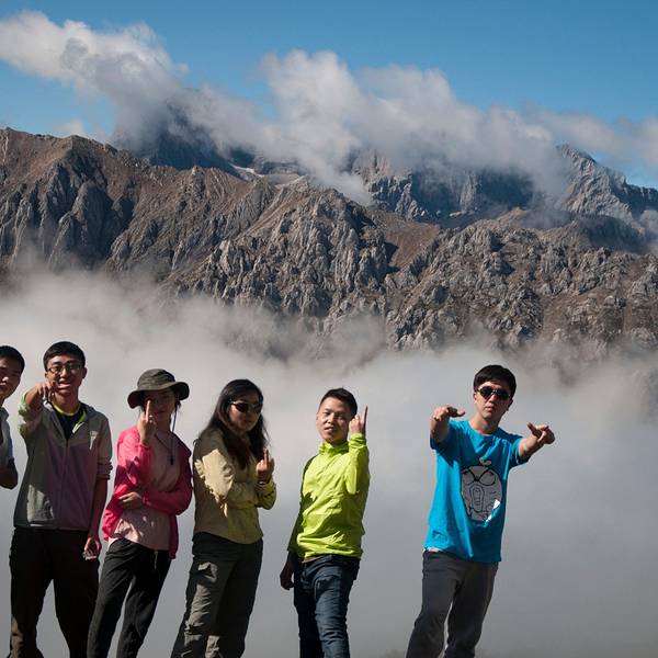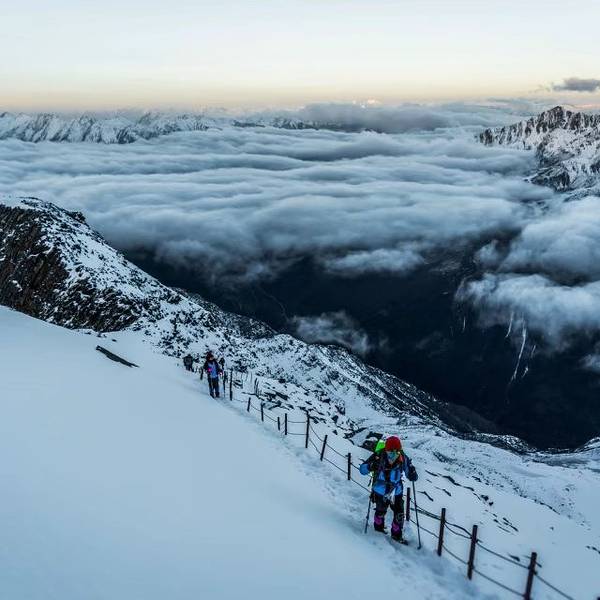 队伍在垭口休息,补充体力,此时的天慢慢开始亮了,美景慢慢突显了出来。
