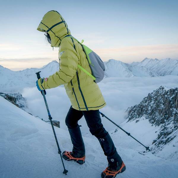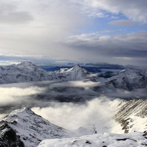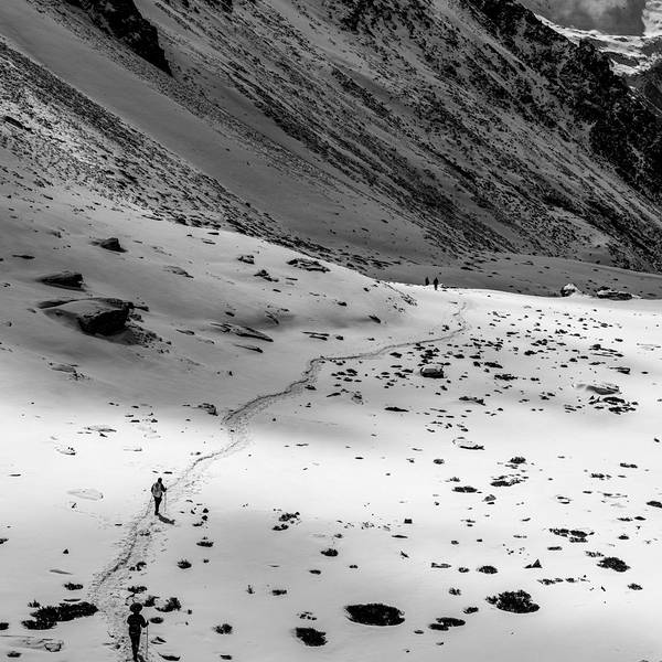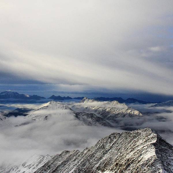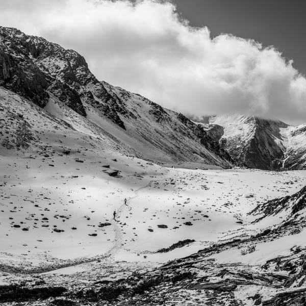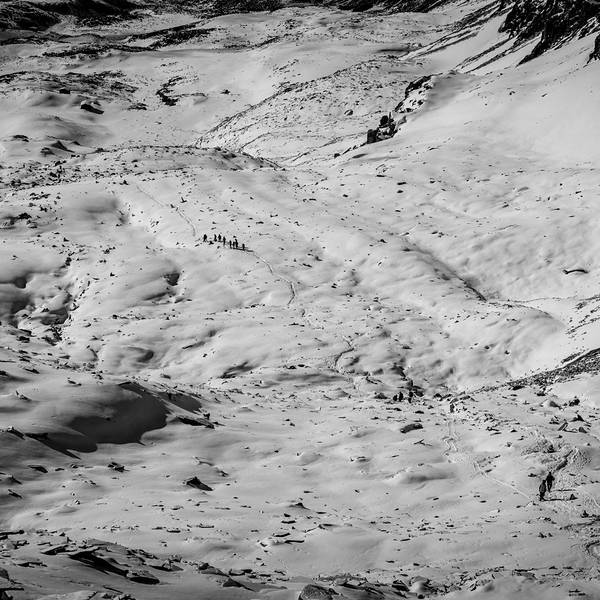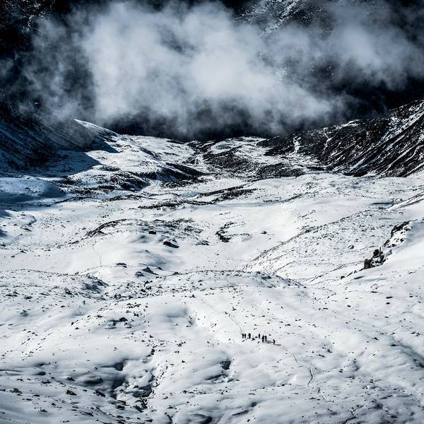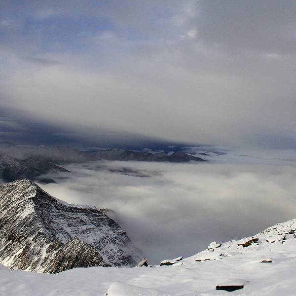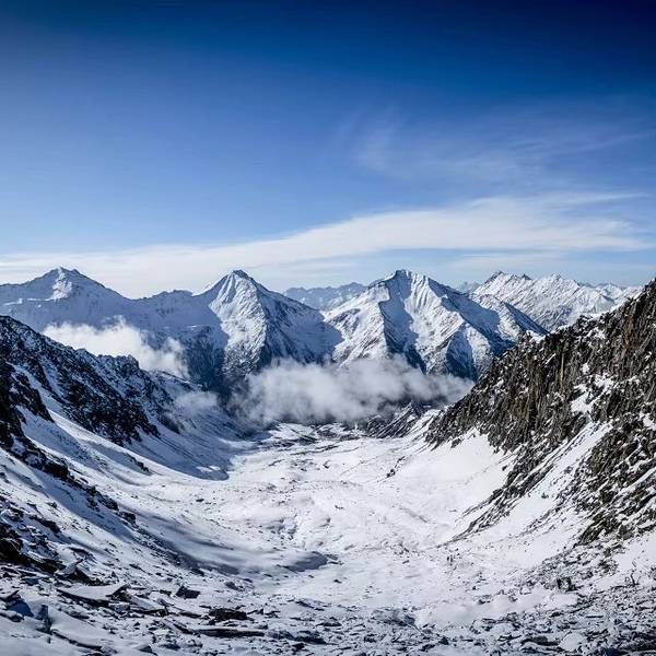 此时垭口上天空骤变, 刮起一阵很大的风 ,冰粒使劲得打在脸上。此地不宜久留 , 好不容易爬上松软滑溜...连跪带爬 ,体能耗尽 , 终于到达海拔4900多米的垭口 。 四周茫茫大雪 ,俯瞰蓝魔之泪 , 冰面上渐渐融化。