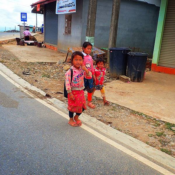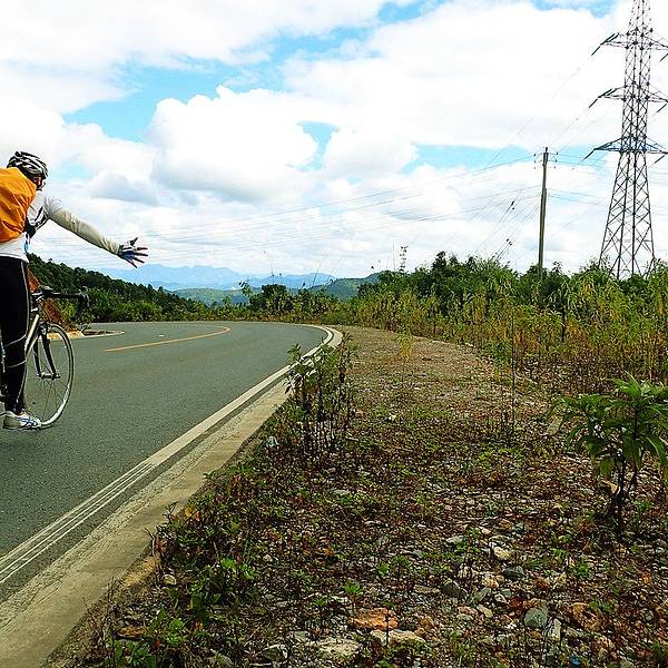 这个餐馆里还摆了几个美国当年留下来的炮弹壳。。。American shots Laos垭口放坡比较委婉,先要搞一段起伏路,基本都是8%,9%的小短陡坡!小朋友都只能推!上坡如存钱,下坡如花钱,上坡如便秘,下坡如拉稀!