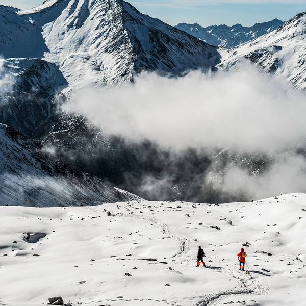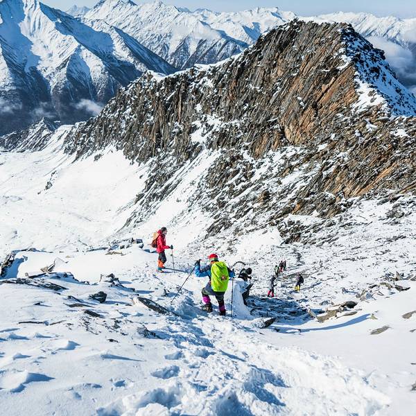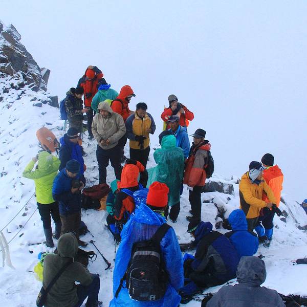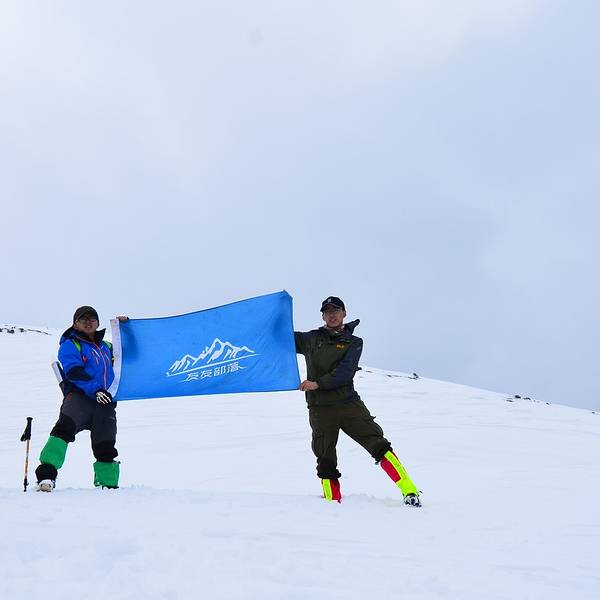 此时垭口上天空骤变, 刮起一阵很大的风 ,冰粒使劲得打在脸上。此地不宜久留 , 好不容易爬上松软滑溜的雪坡拍个合照后闪人了。勇哥和老贾 此行领队登顶小分队 展开