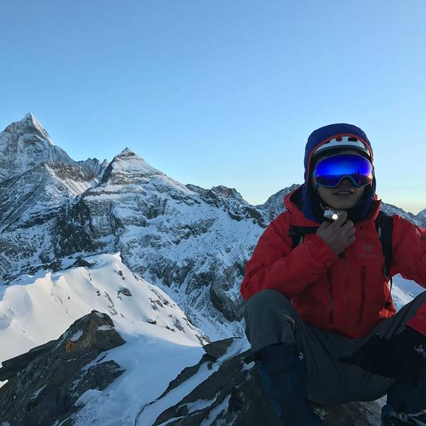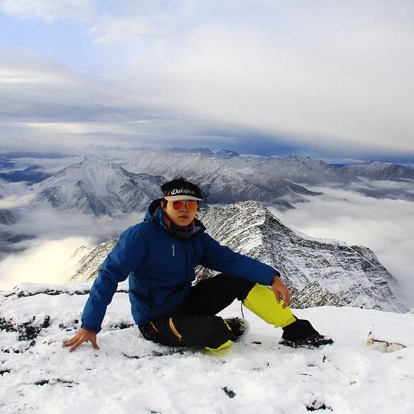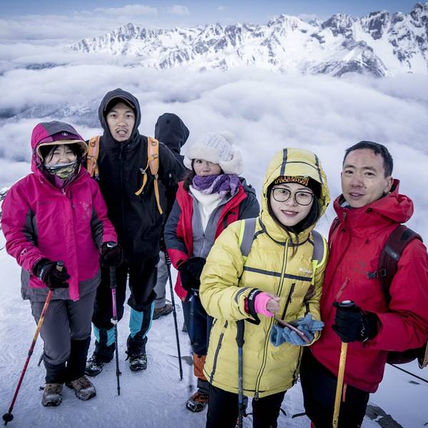 《佛光》继续给陆续下撤的人员拍到此一游照。3年前我还没带队之前,跟随别的队伍去贡嘎,当时我还是个稚嫩的孩子,人也太多,可能记不清了。。。但晓乐确实是当时的队友,在讨论组的时候她发现了我,那时候突然间感觉户外圈确实小,他乡遇故人的感觉。。。此图给他P瘦了腰和腿~~你们可以自行脑补原始画面。。。佛光为我们照亮前行的路继续等待最后两名冲顶的队员,笑看人生和辉哥,50岁的大哥最后一个上去,为了圆梦我并没有阻止他,虽然他的速度已经有点超出我预计下撤时间了,我等着他,帮他圆梦。。。