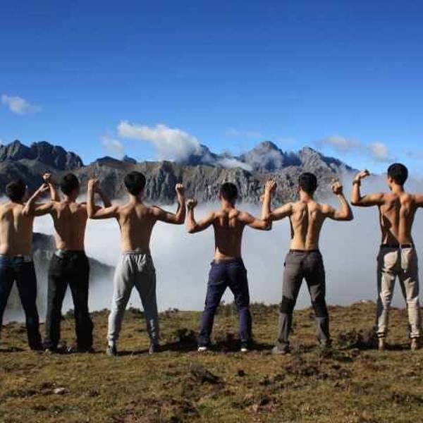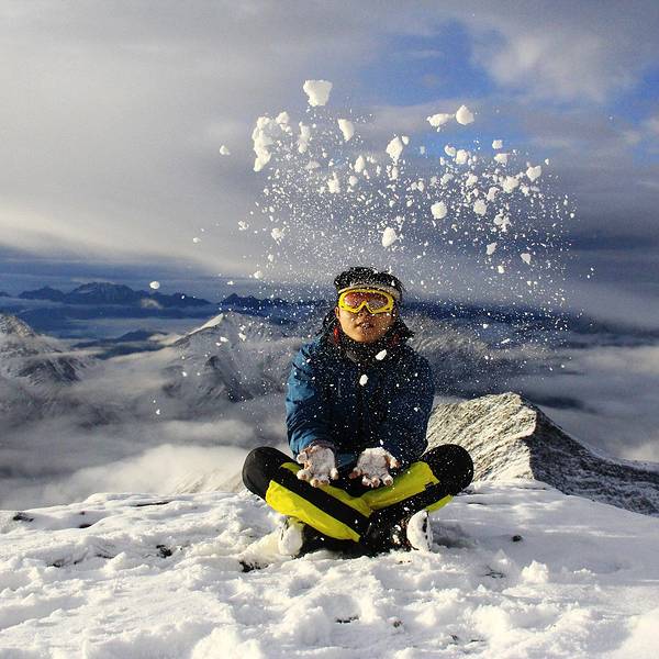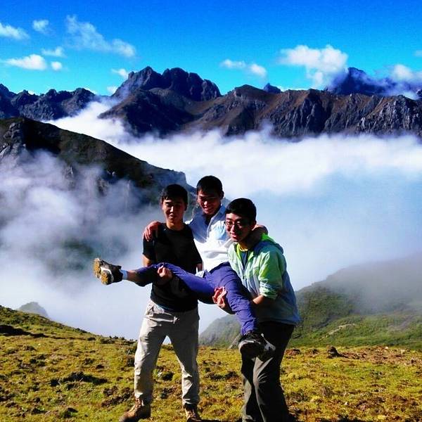 我们怎么可以这么牛逼,怎么可以吃兔兔!终于来到了垭口处,还有几十米到山顶,可。。。我。。。不。。。。想。。。走了,索性就在垭口处拍拍照好了,顺便等最后一名冲顶的人下来。一秒增高,就是这么任性。。。《地鼠大魔王》这个平台处挂着风,又晒不到太阳,手脚直接冻的没有知觉了,我80块钱的始祖鸟袜子竟然不顶事!!!冻死宝宝了,一直在原地跳来跳去的保暖,等待着冲顶队伍下撤下来每人给他们拍一张到此一游照,就这样。。。等啊等啊等啊等。。。。明眼人应该已经看出来了,这张是合成的。。。下图中人物的披风背在小熊猫的包里,可是那个怂蛋竟然没有爬上来。。。如果把这披风带上来了,拍照绝对又要占领各大封面了!为了弥补可惜。。只能PS一张玩玩,过过瘾了。。。下一个目的地的封面照应该将会是它了!骚痘痘在山顶装逼成功了。