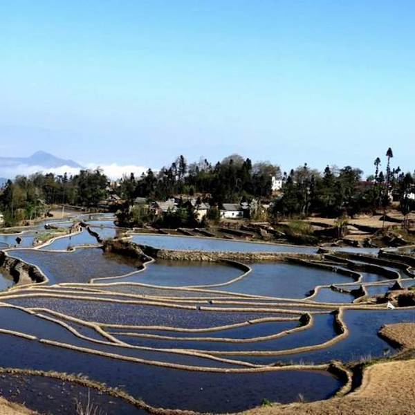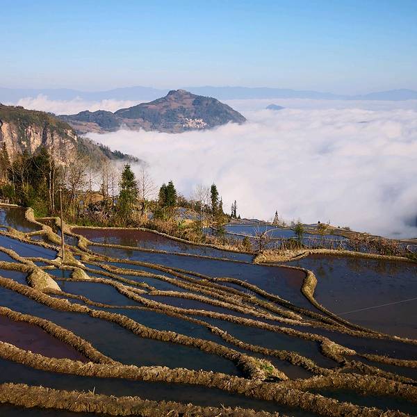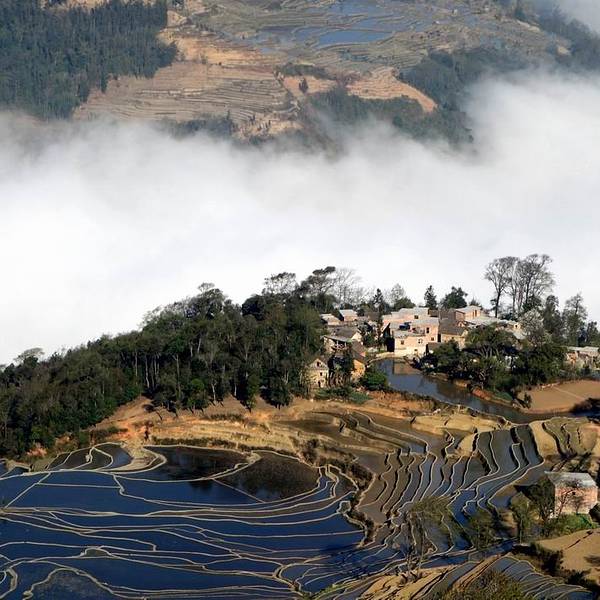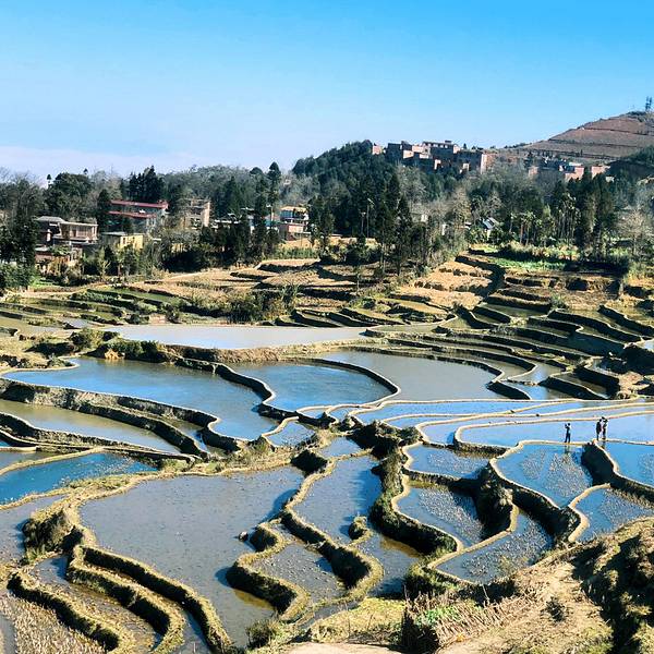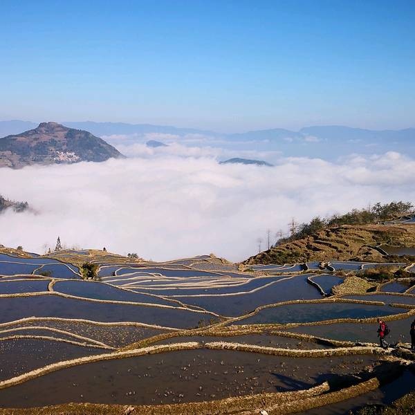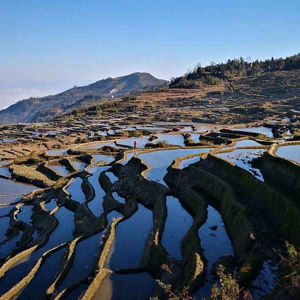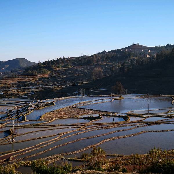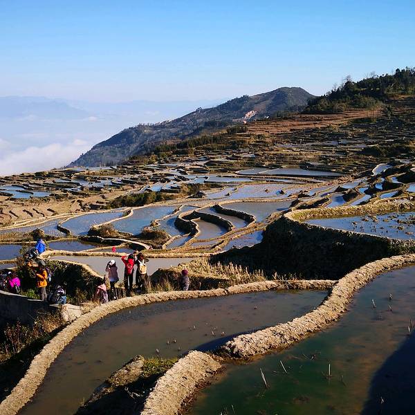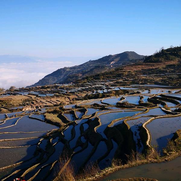 天光云影,水天一色,颇为好看。每年1—2月是爱春梯田最美时期,而观赏蓝色梯田则只有上午9—10点钟爱春梯田在多依树梯田对面的山坡上,我们驾车前行30分钟左右抵达爱春村,左转进入村庄小路,将车停在梯田边上的私人停车场。从上往下走,层层梯田尽收眼底。田里都灌满了水,在阳光照耀下,蓝天映衬在水面上,呈...爱春梯田在多依树梯田对面的山坡上,我们驾车前行30分钟左右抵达爱春村,左转进入村庄小路,将车停在梯田边上的私人停车场。从上往下走,层层梯田尽收眼底。田里都灌满了水,在阳光照耀下,蓝天映衬在水面上,呈现出一片蓝色的梯田。天光云影,水天一色,颇为好看。远处的小山笼罩在云海之中,只露出山尖,更增添了此处风景的壮美。每年1—2月是爱春梯田最美时期,而观赏蓝色梯田则只有上午9—10点钟。我们来得正是时候,可谓大饱眼福了!下午6点到坝达梯田看日落。观景台比我们前年来时,有很大的改变,设施都更新了。大家终于等到太阳下山那一刻,但日落时美妙景色并没有出现。很扫兴的。实话实说,此时的坝达梯田并没有上次我们看到的那样壮美,主要是约有三分之一的梯田没有灌水,影响观赏效果。 展开
